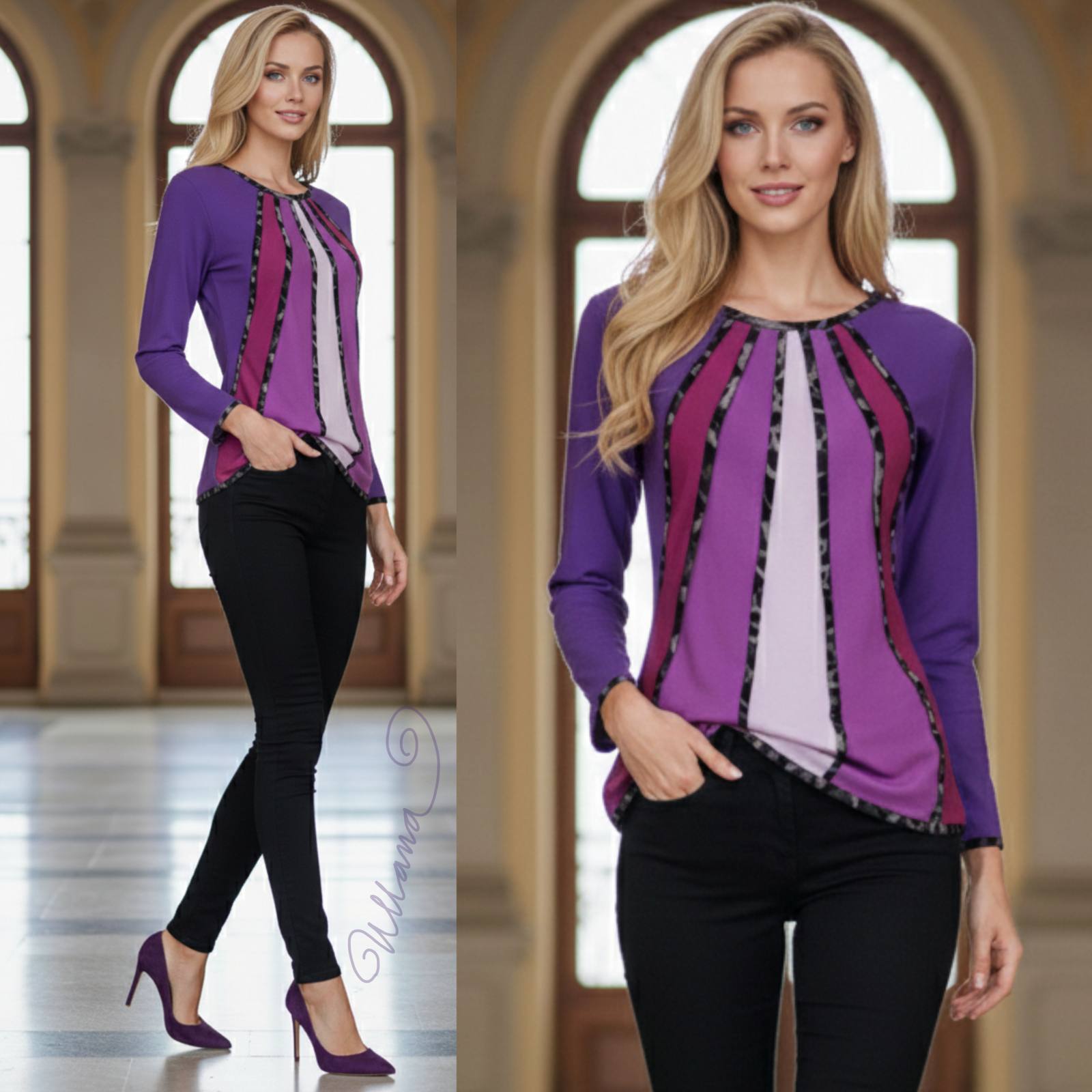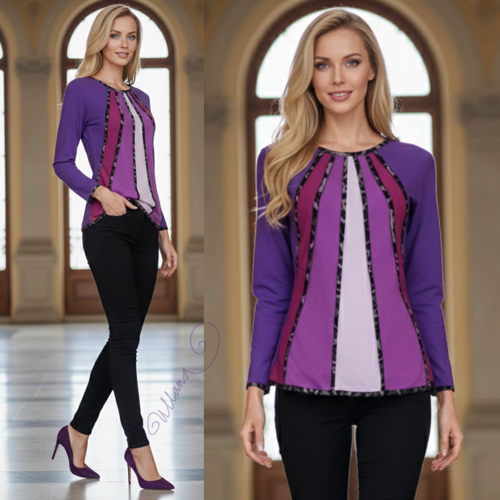 Majica v vijola odtenkih z všitki in obrobami v tigrastem vzorcu.