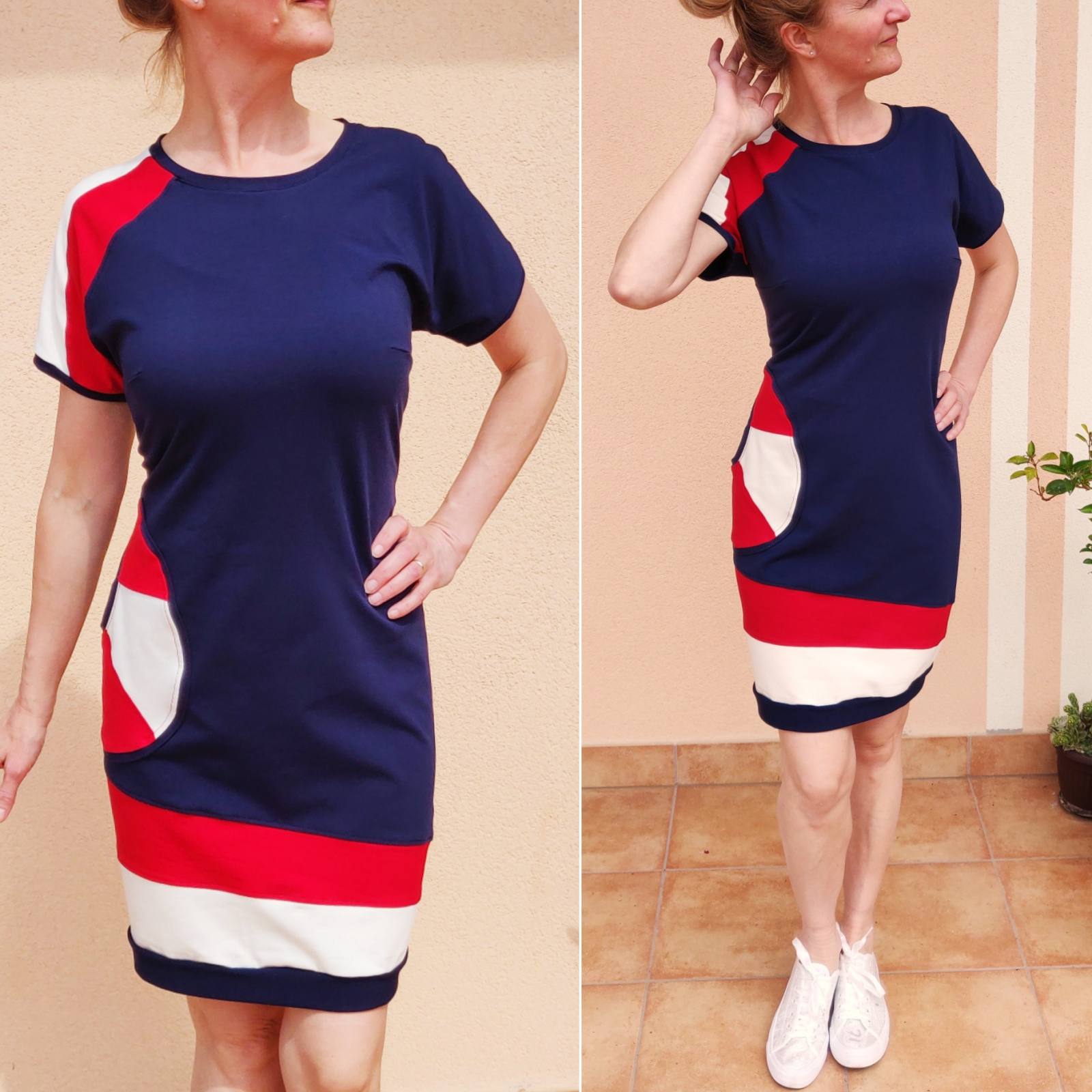 Mornarsko temno modra oblekica z dodatki v beli in reči. Telirana, da lepo poudari postavo. Ima en uporaben večji žep. Material: bombaž 95%, 5% elastan