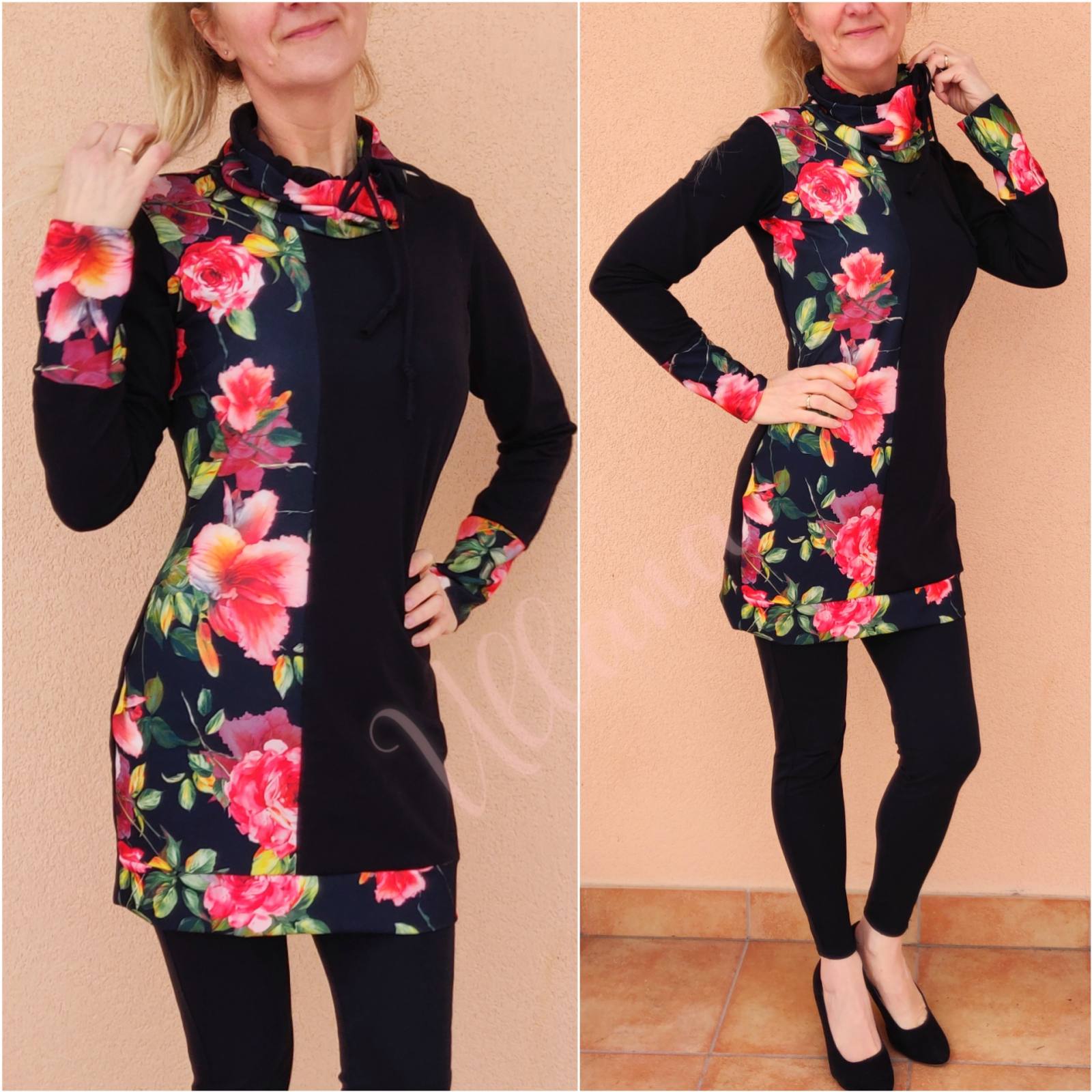Prijetna, lepa tunika s črno osnovo in dodatkom potiskanih rož. Visok ovratnik se regulira z vrvico. Prijetna, klasična tunika za na pajkice, hlače.