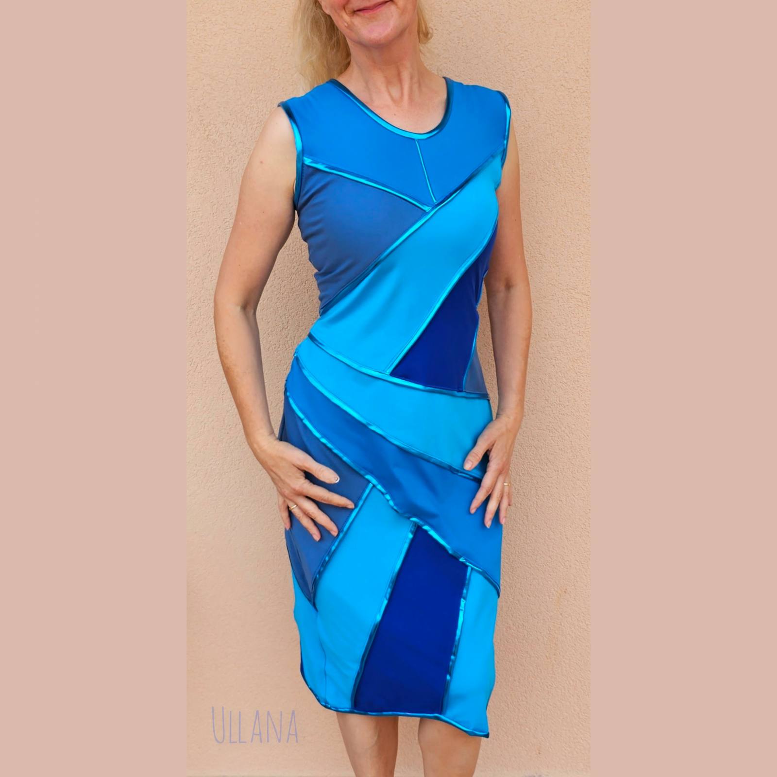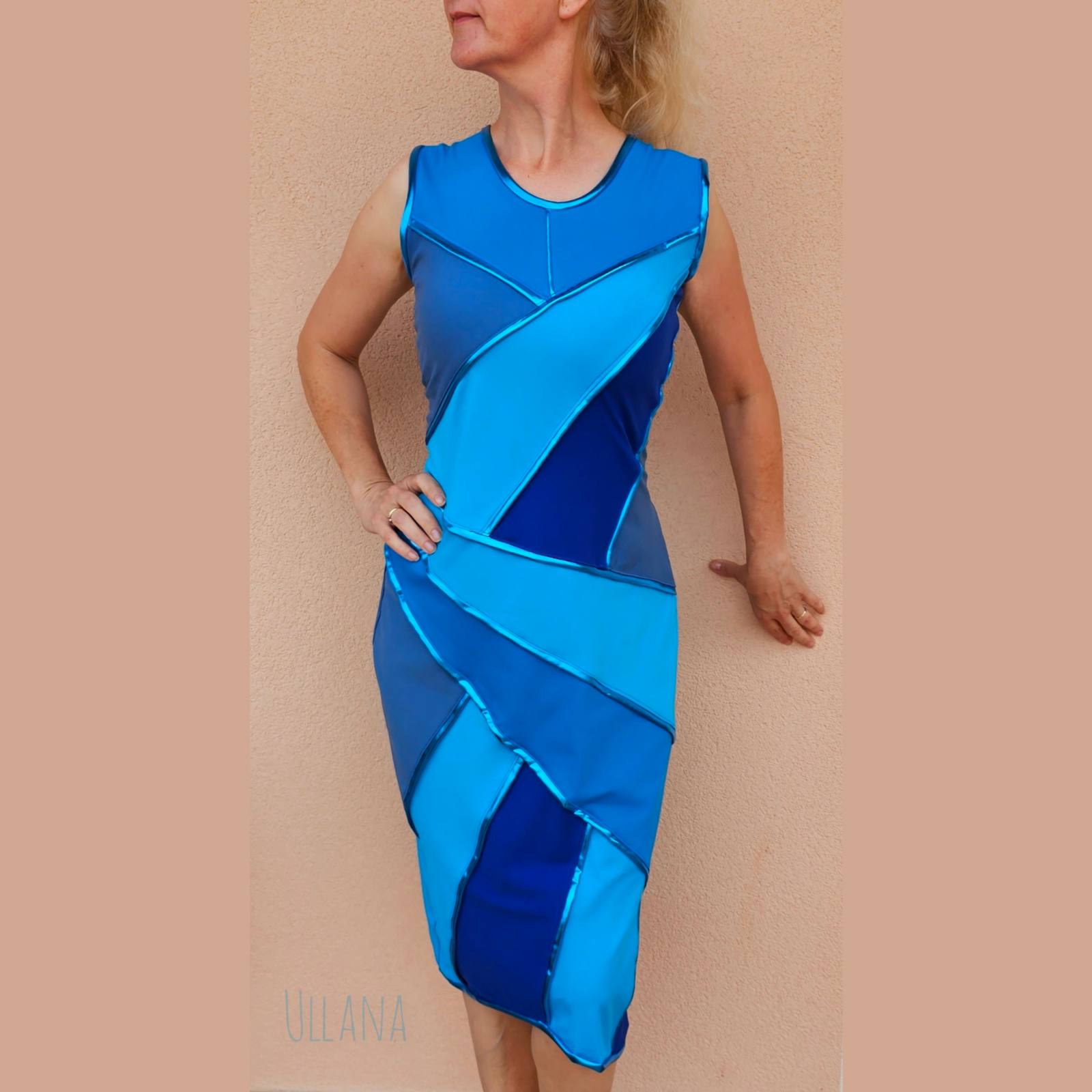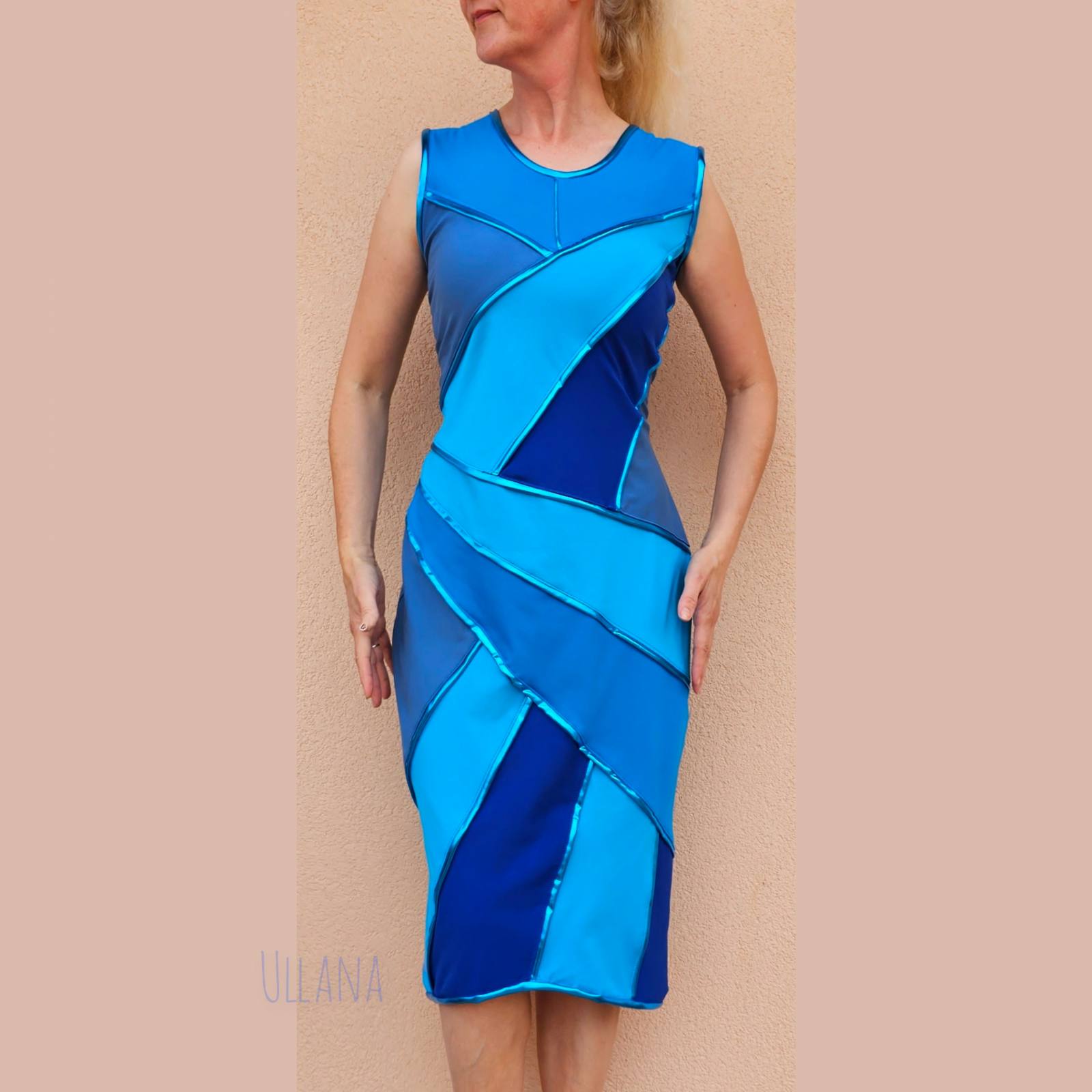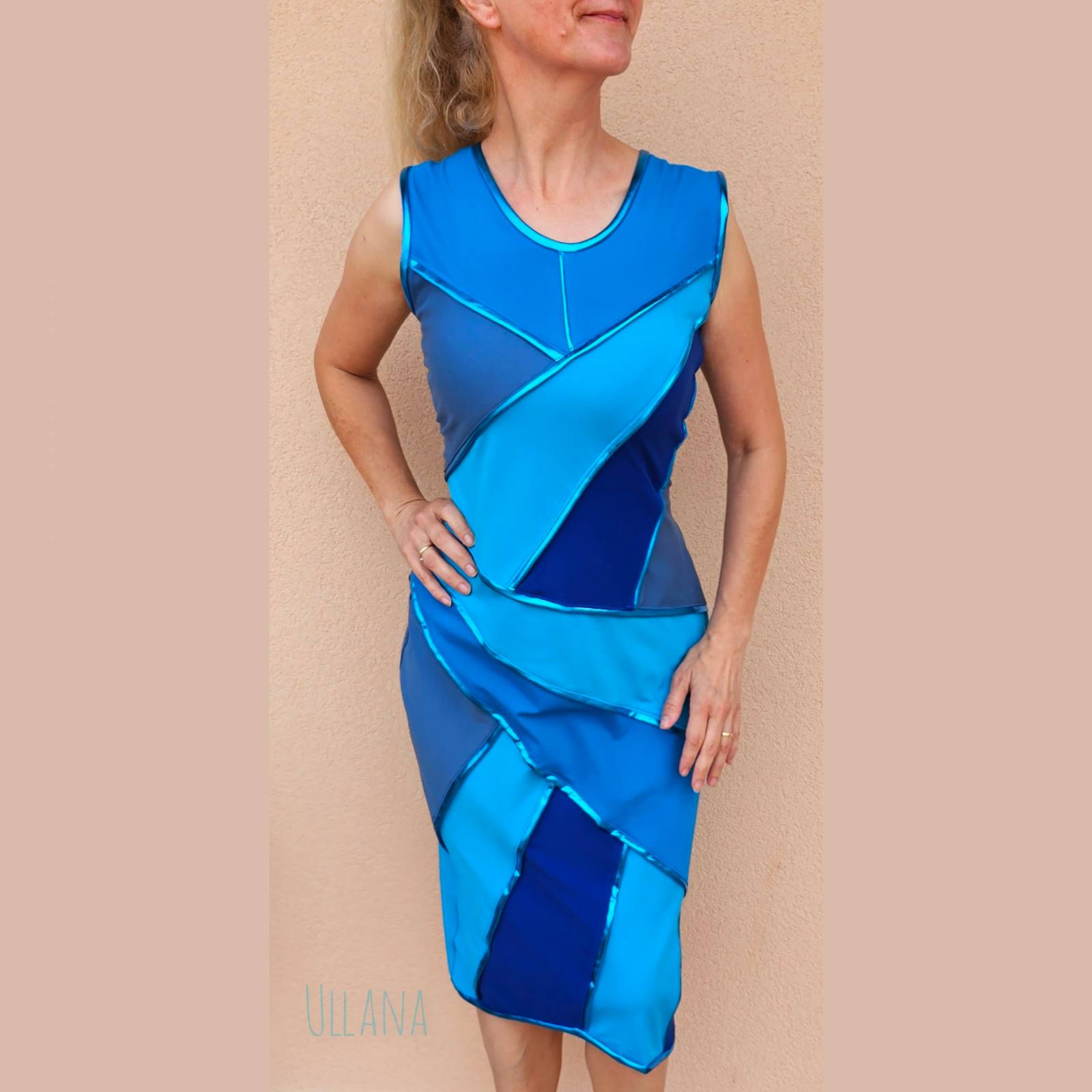 V modrih odtenkih z dodanimi všitki in obrobami v modri s kovinskim leskom.
