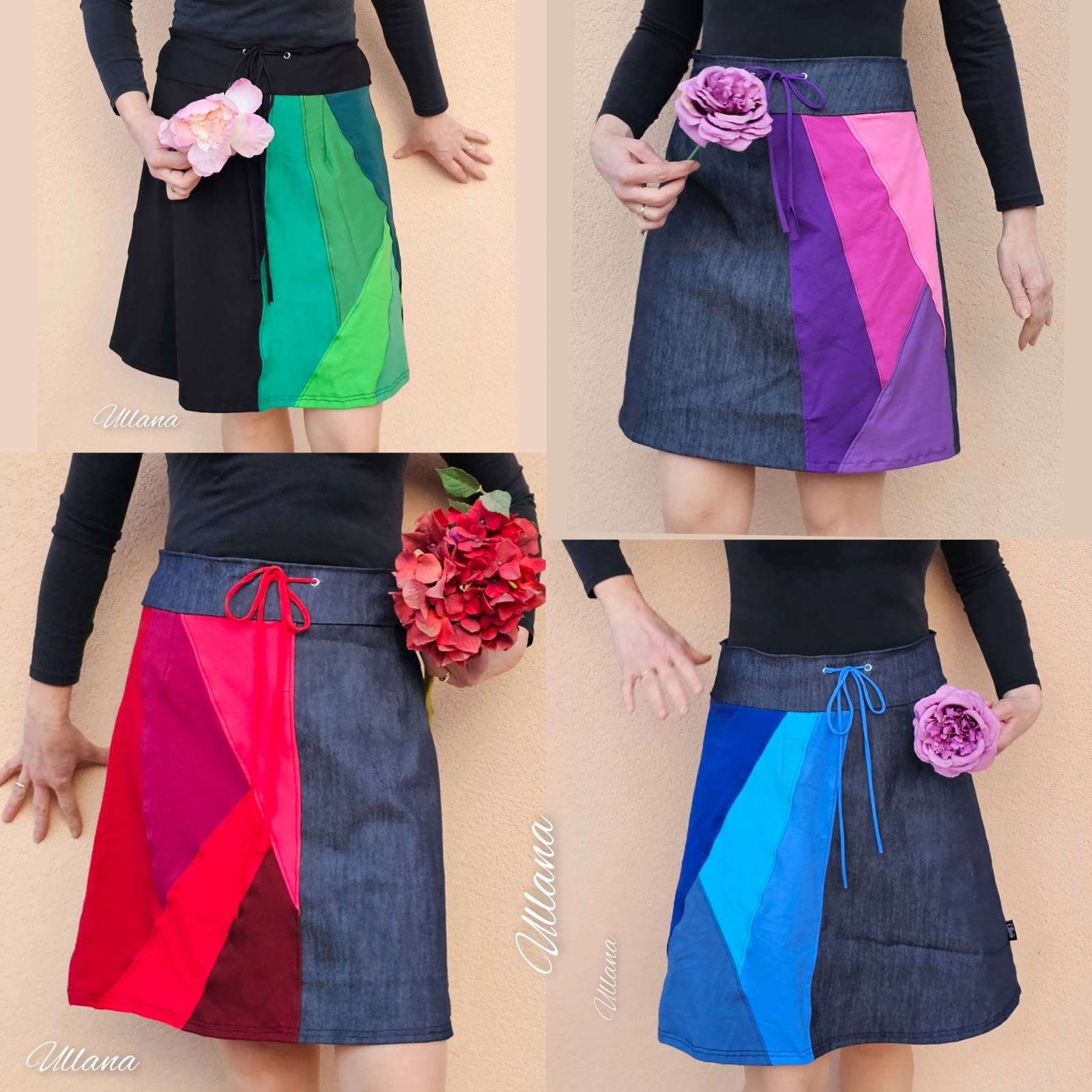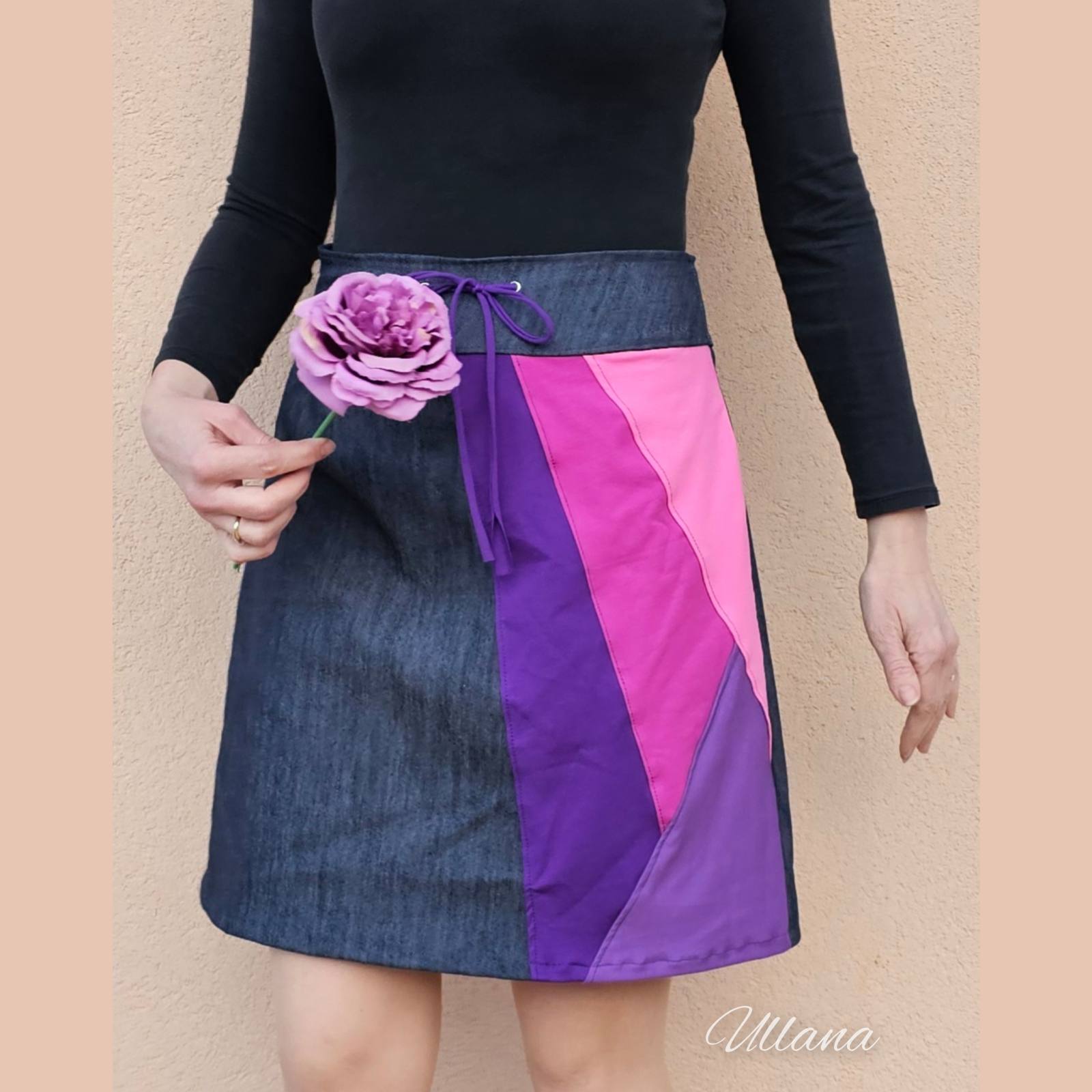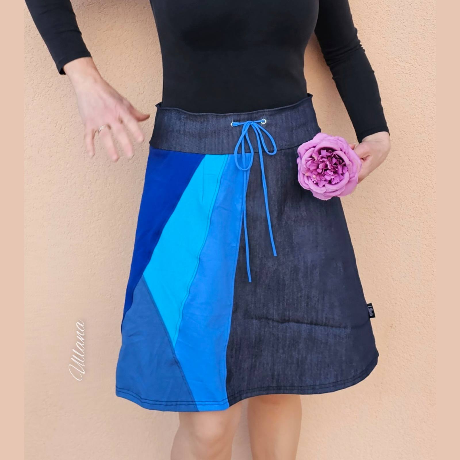 Krilo v rahlo zvončastem kroju. Osnova je tanjši raztegljiv jeans. Širši pas z vrvico za reguliranje širine. Dodatki v modrih odtenkih. Dolžina krila: pas = 7 cm, dolžina od pasu = 45 cm. Možna je izdelava po meri in tudi dolžina se lahko prilagodi. Želje/mere zapišite v opombe pred oddajo naročila.