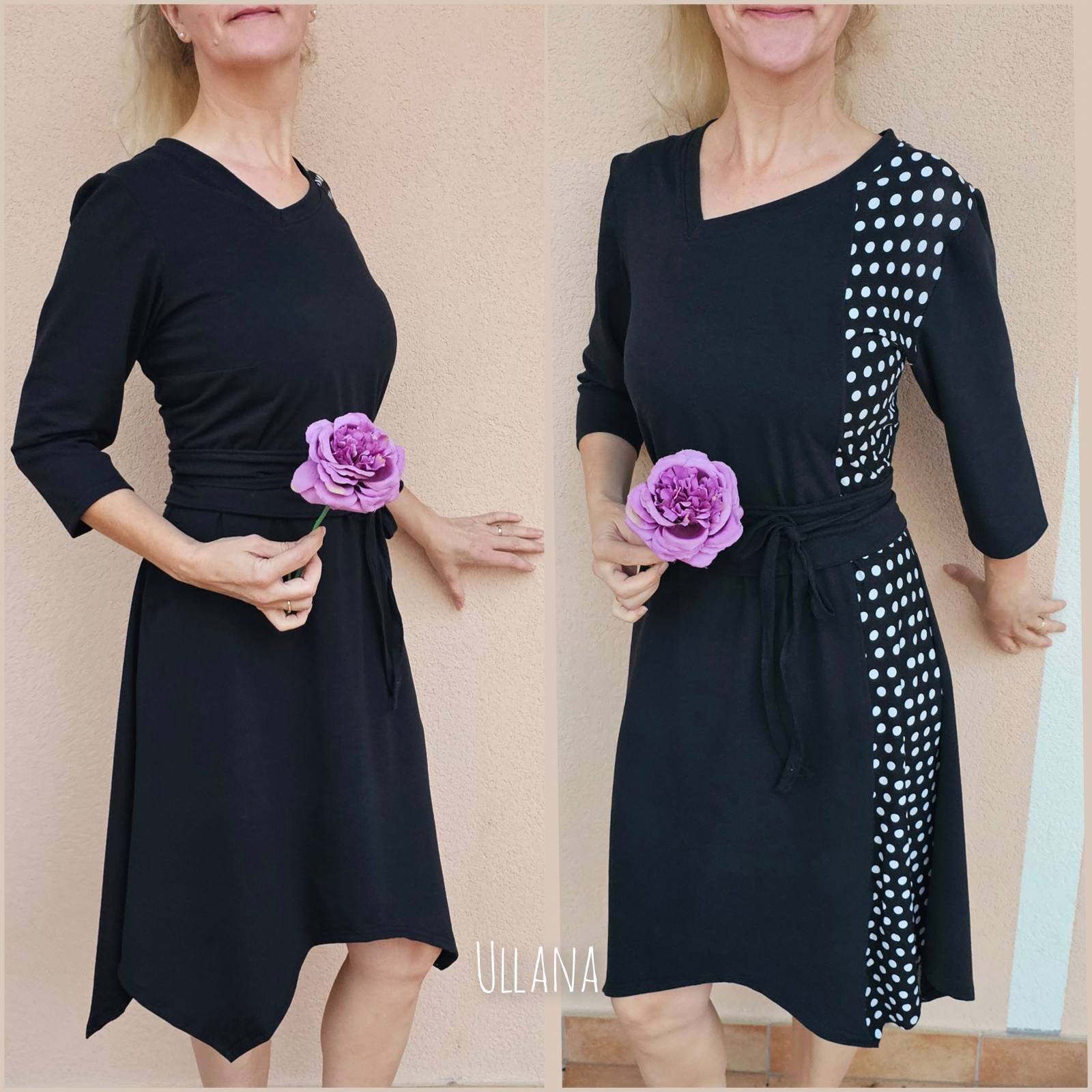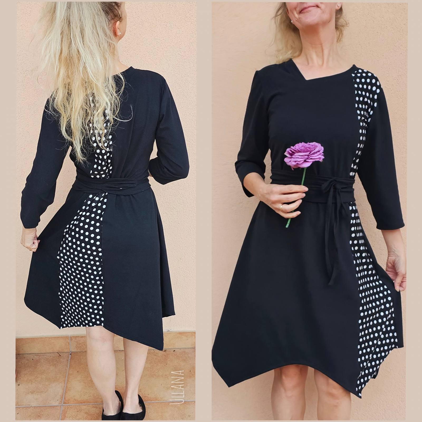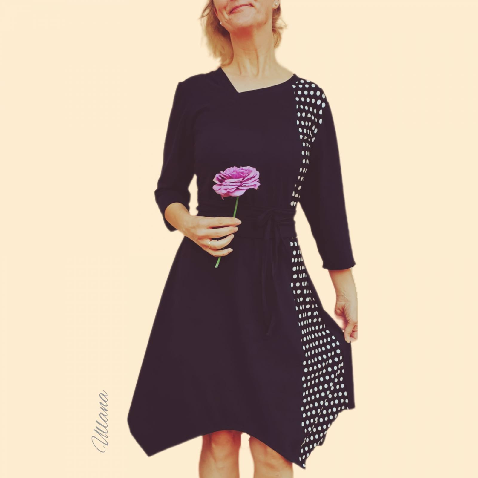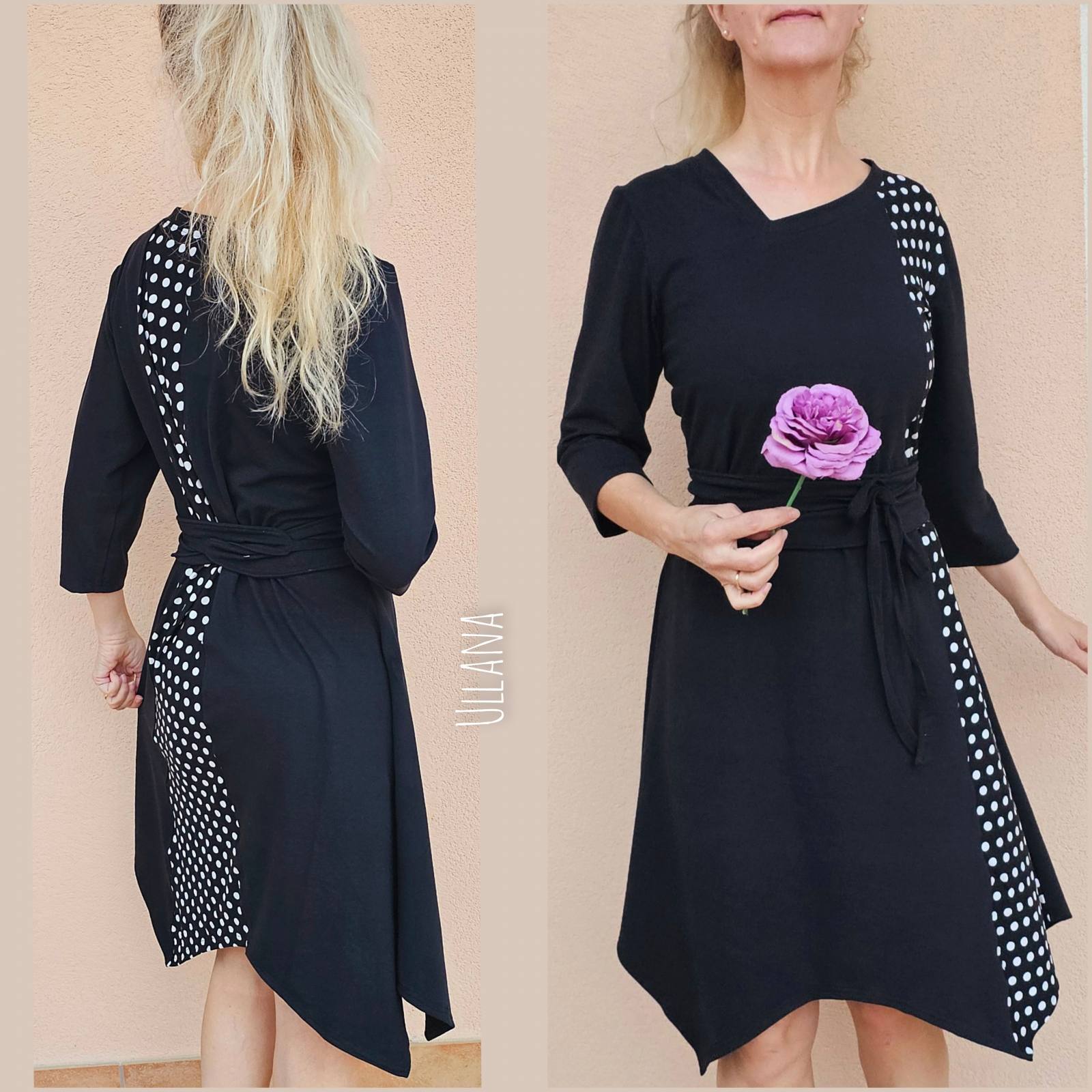 Oblekica v črni osnovi + dodatki v črni z belimi pikami. Udoben kroj. Spodnji rob asimetričen, krilo pada navzven (krojeno na A).