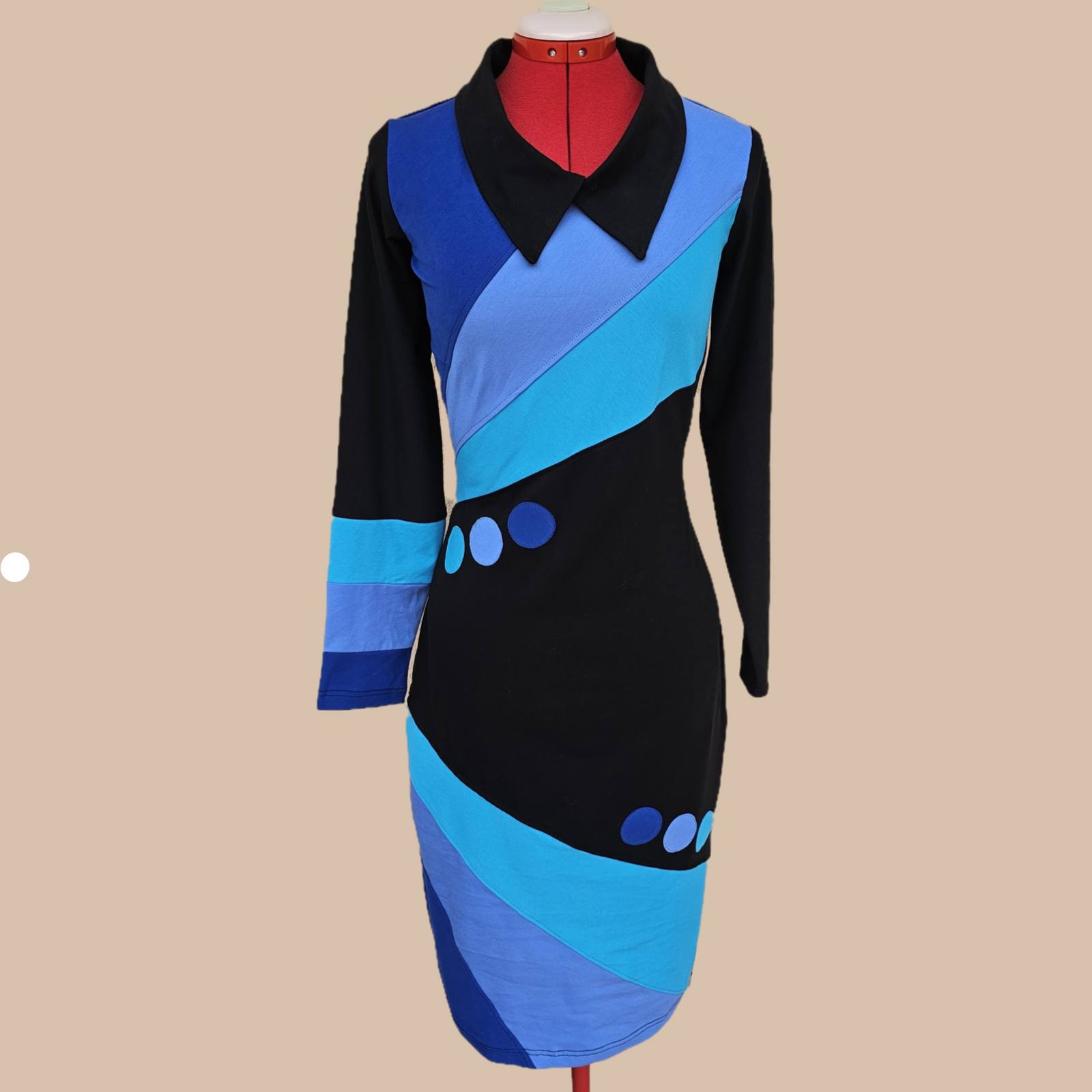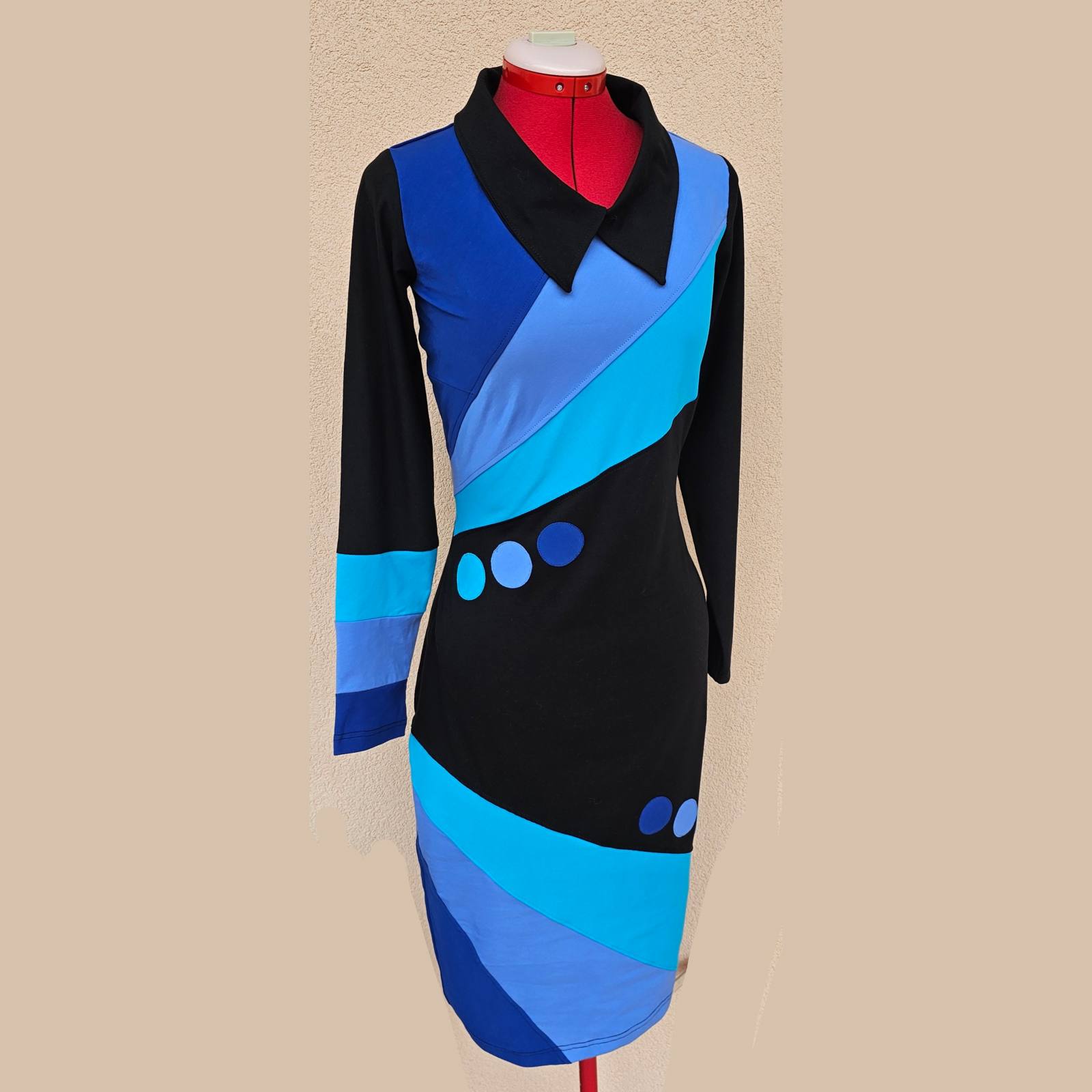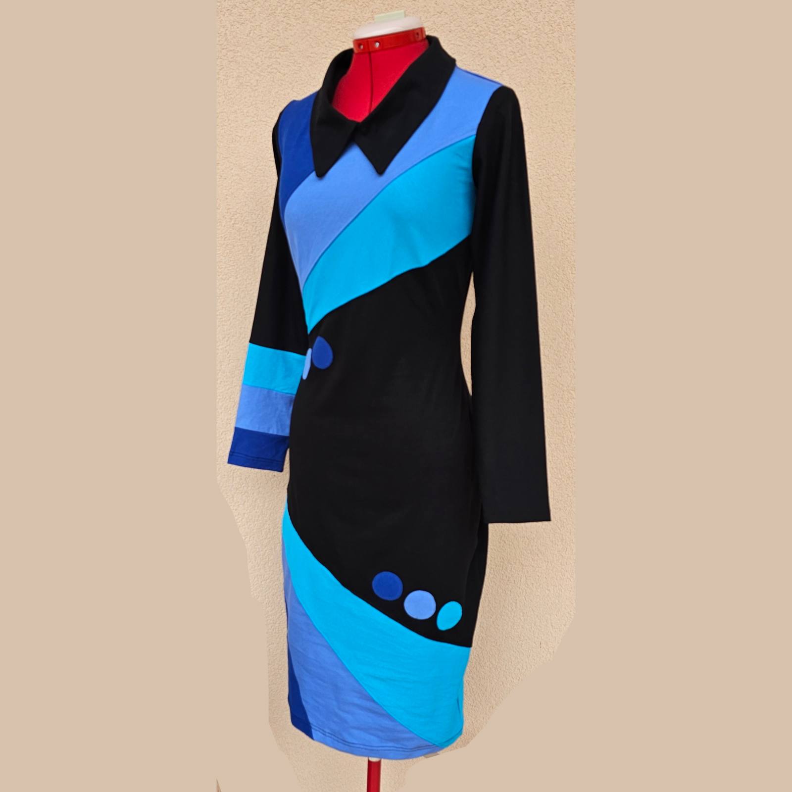 Obleka v črni osnovi. Z dodatki v modrih odtenkih. Srajčni ovratnik. Telirana in malo daljša varianta (merjeno od ramenskega šiva = 110 cm, lahko pa se dolžina izdela po želji (krajša, daljša)