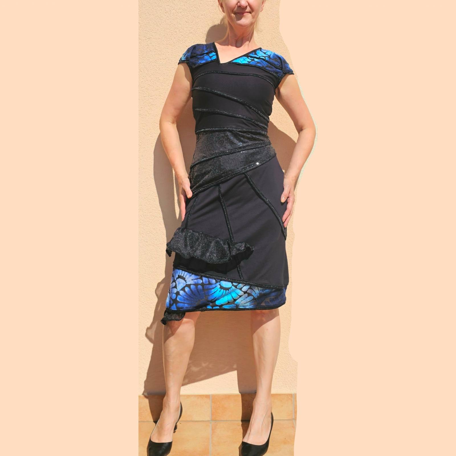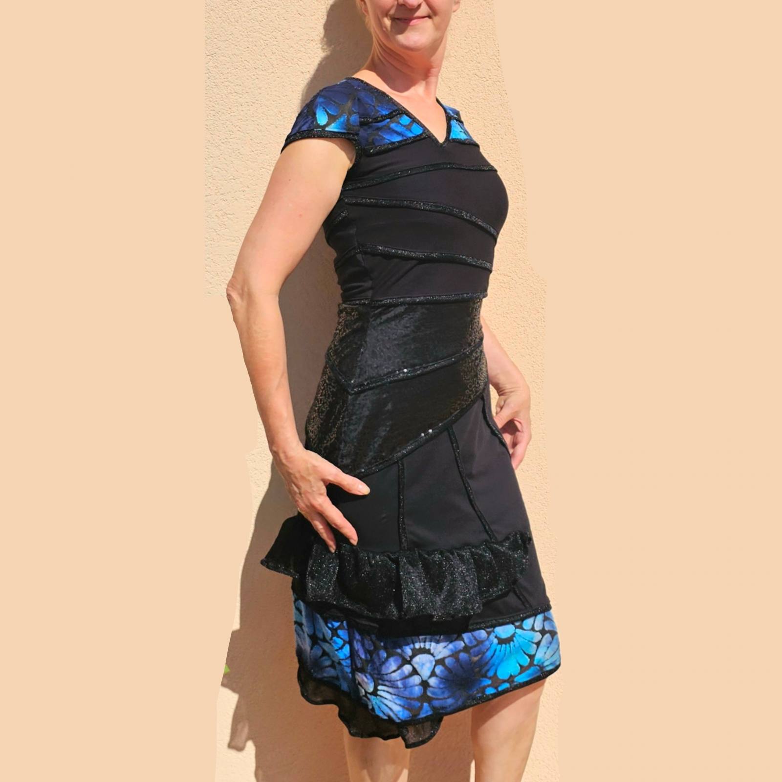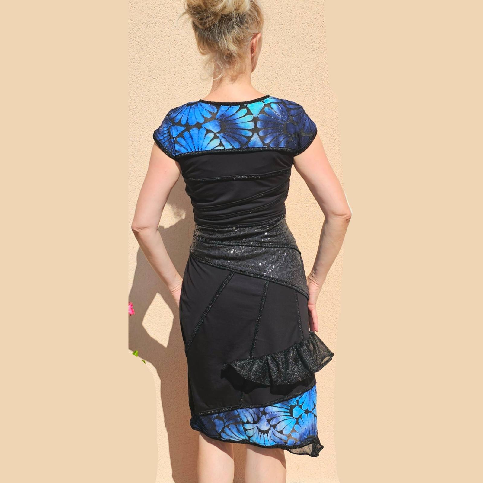 Zgornji del in čisto spodaj v prelivajoče modrem blagu, ki je deloma rahlo prosojen kot čipka.