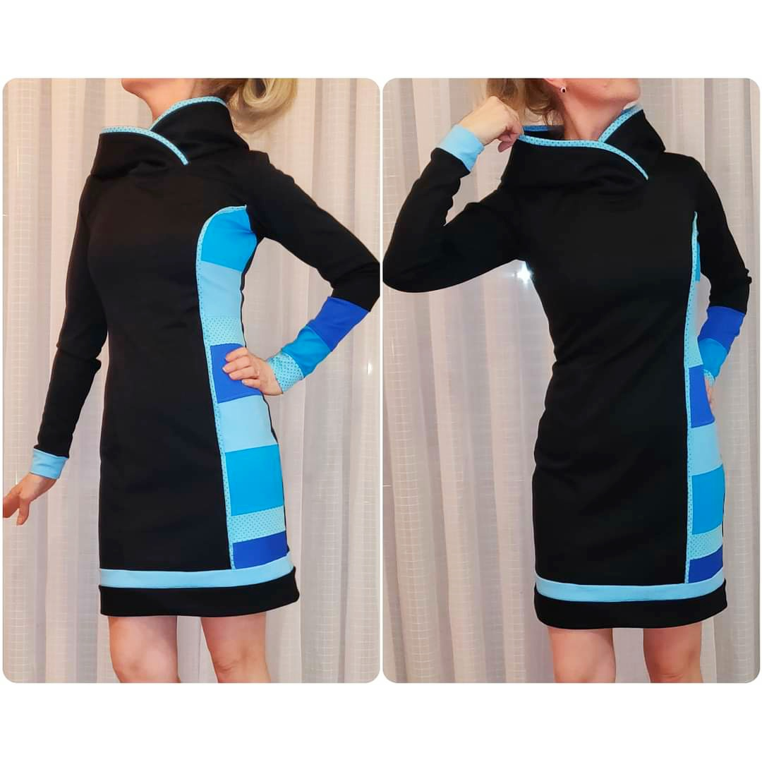 Obleka v črni osnovi v kombinaciji z modrimi odtenki. Asimetrično rezano blago naredi obleko zanimivo, dinamično. Kapuca. Rokav je lahko dolg, 3/4 ali kratek. (želje zapišite v opombe).