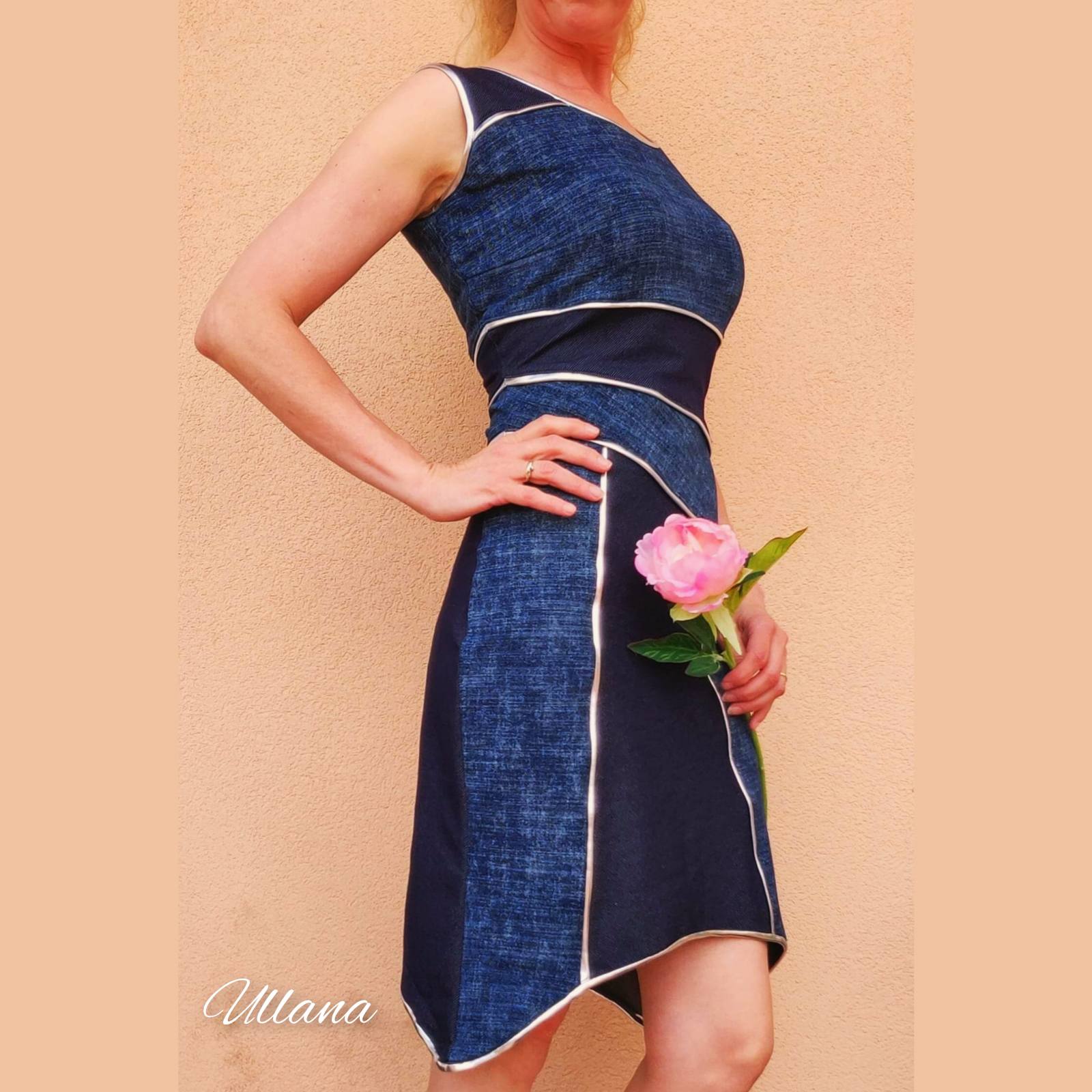 Obleka v kombinaciji temno modre in imitacije (videz) jeansa.