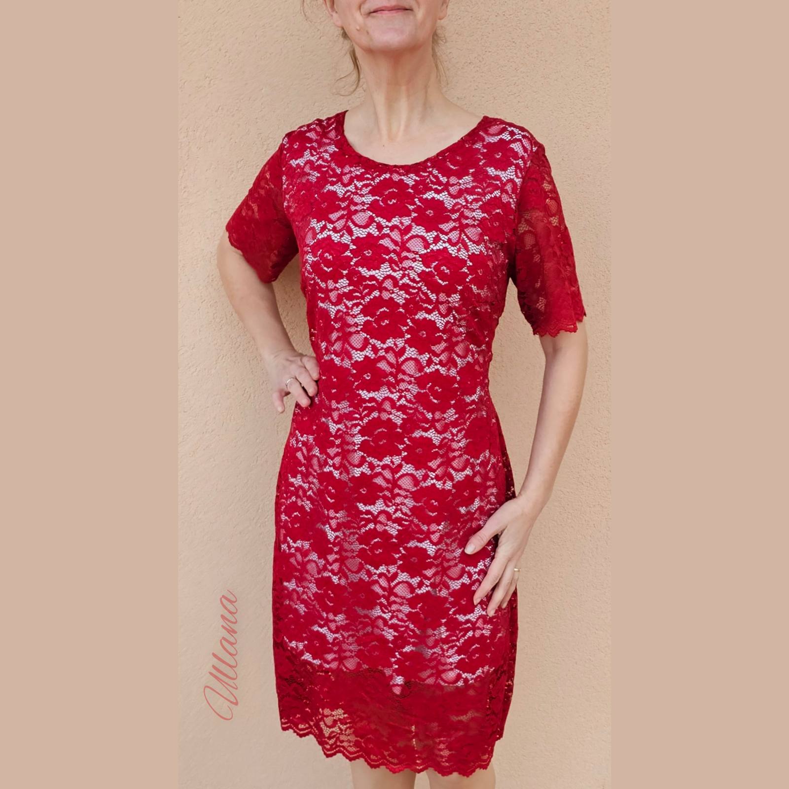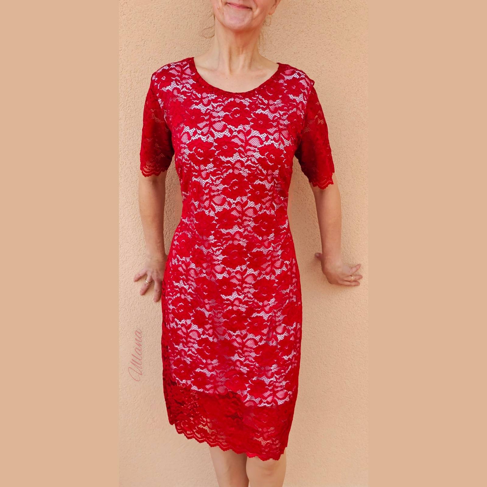 Krasna oblekica s čipko. Čipk je črne barve, podlaga pod čipko pa svetlo lila, po želji je podlaga lahko tudi druge barve.