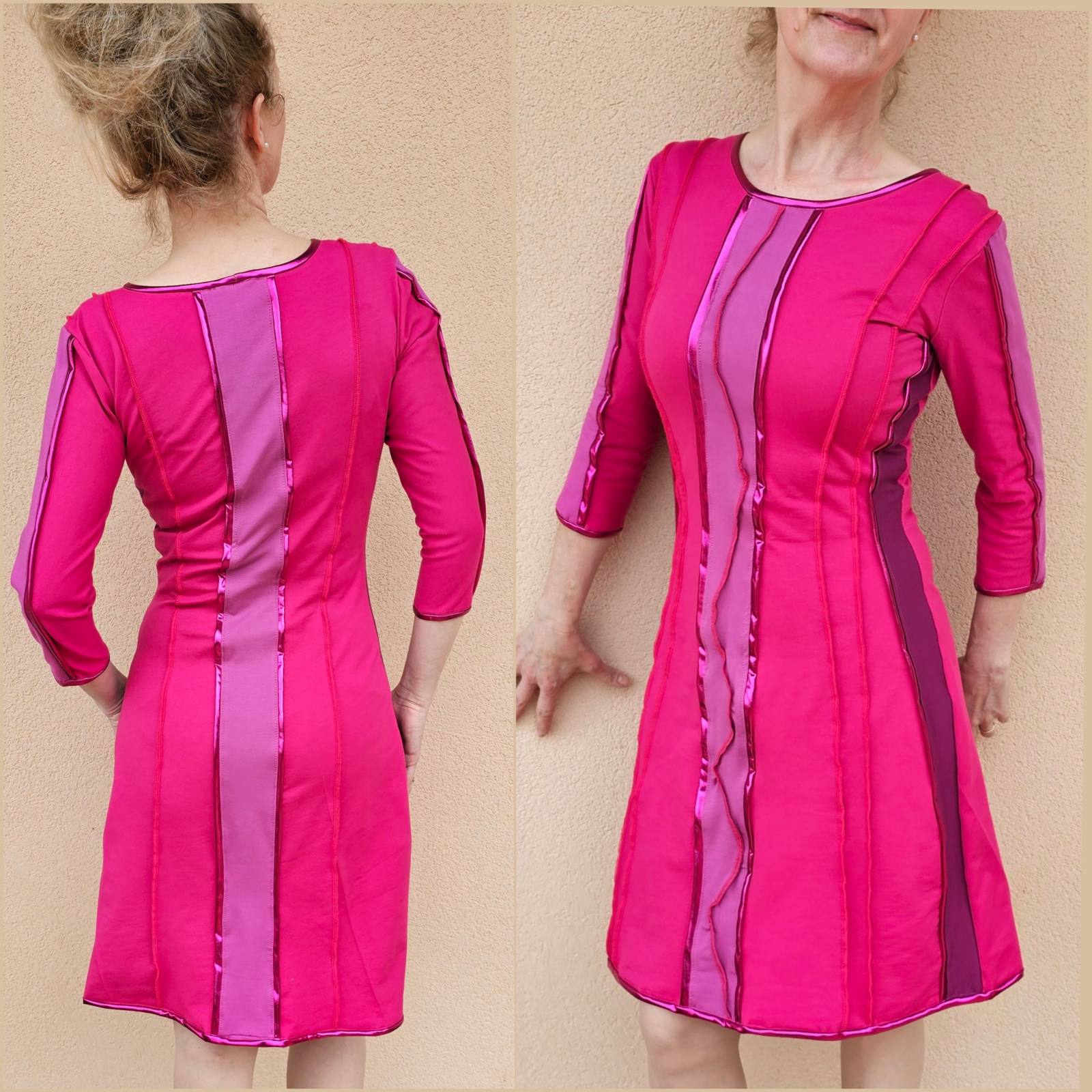 Všitki in obrobe iz roza blaga s kovinskim leskom.