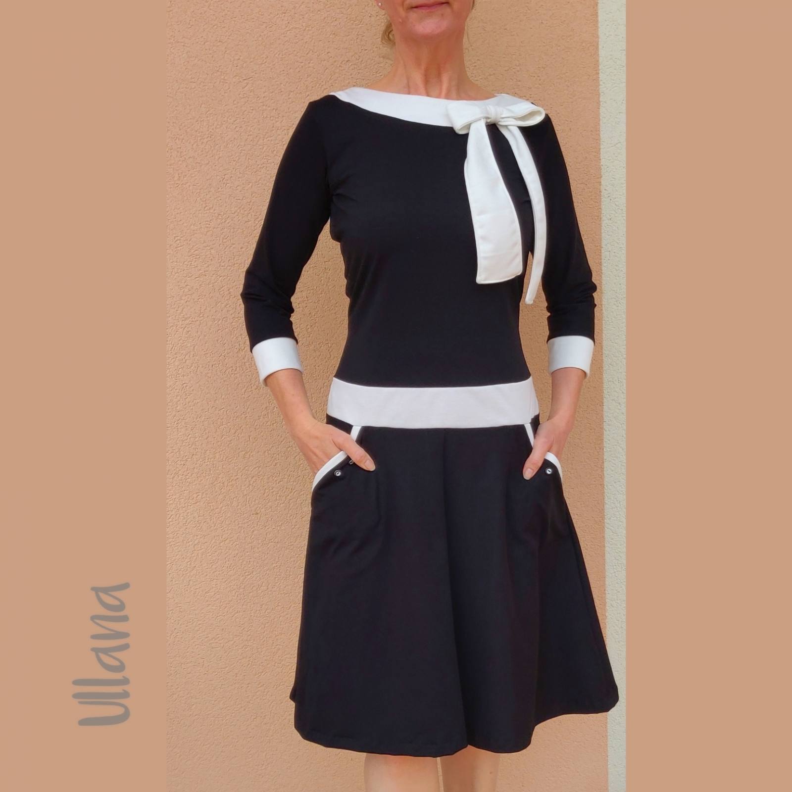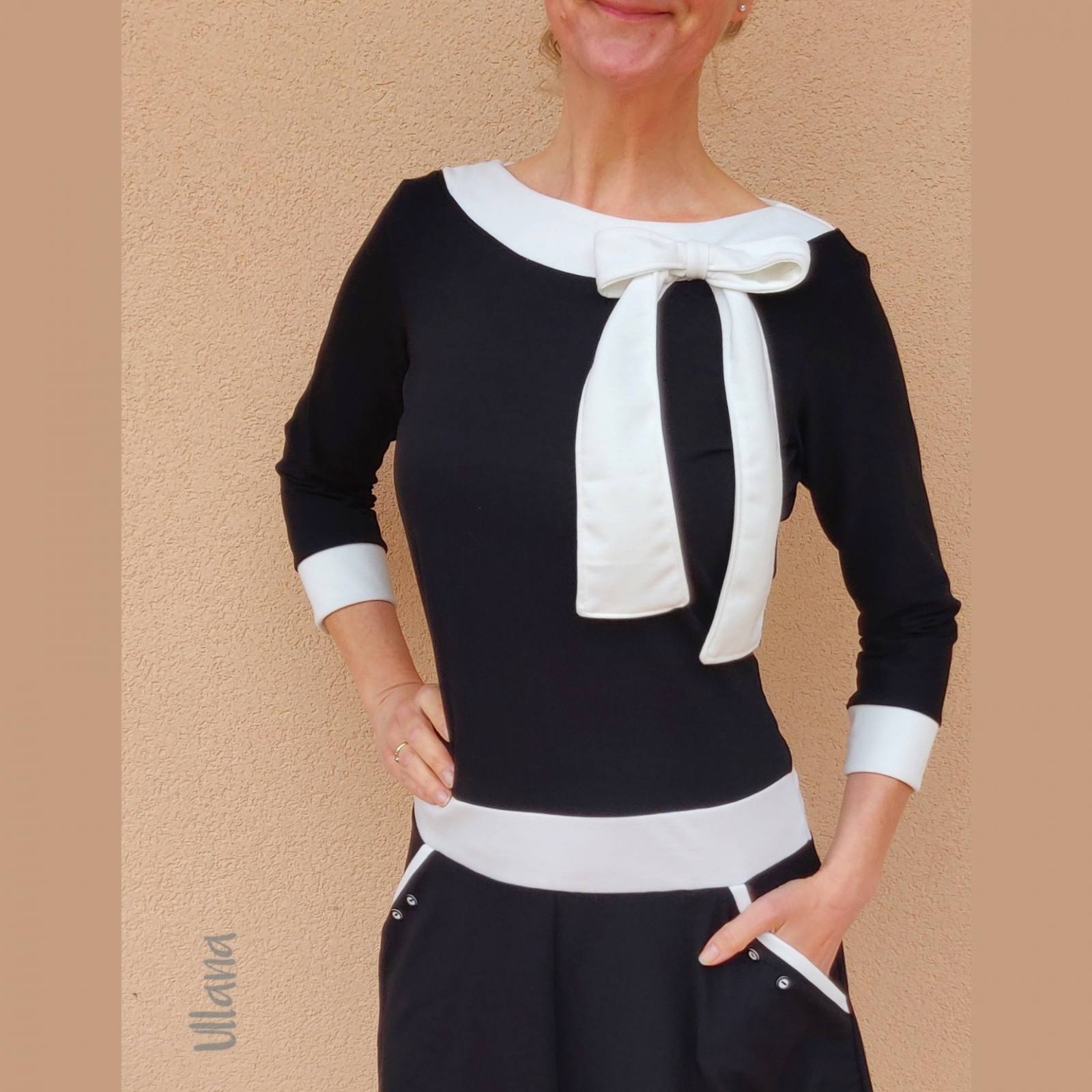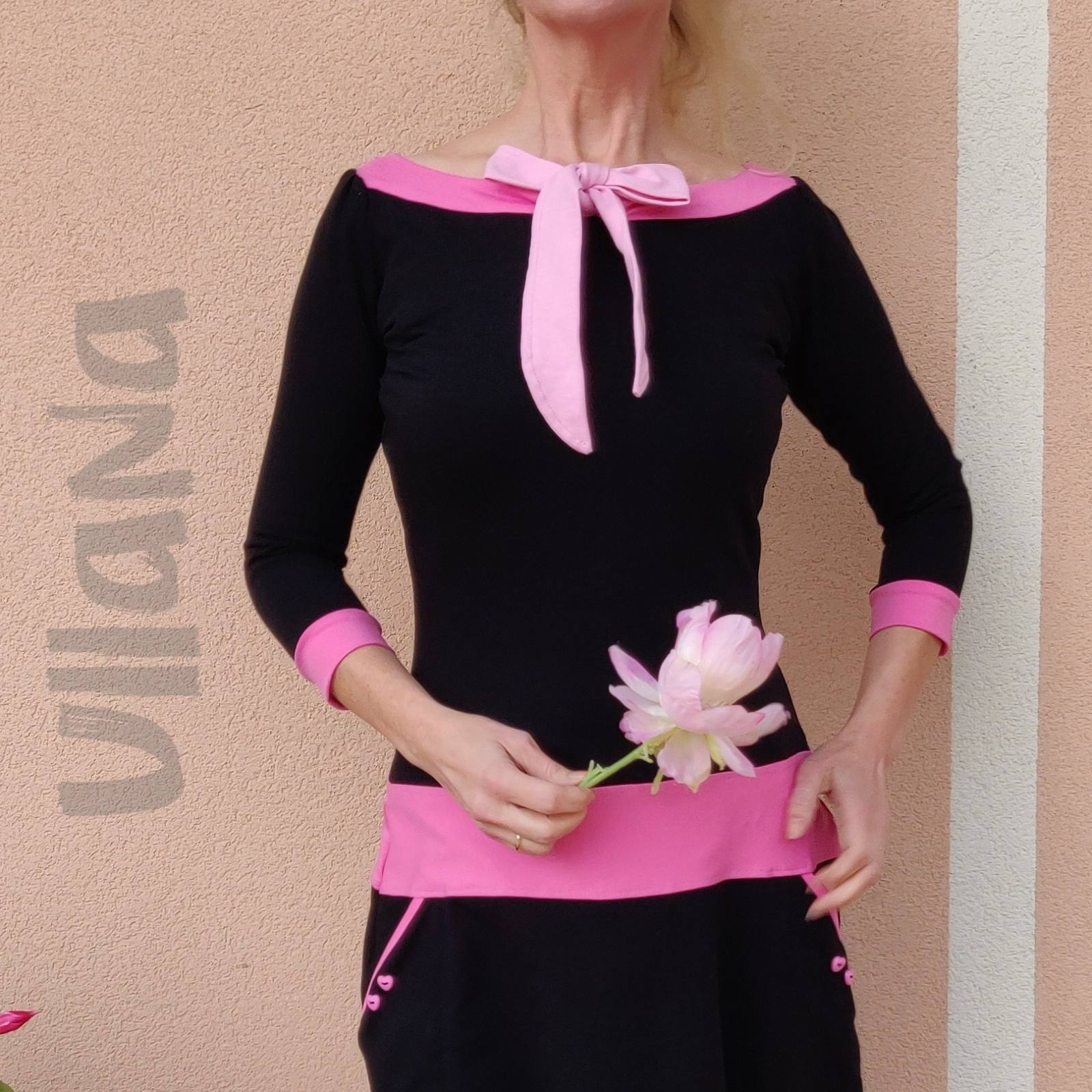 Oblekica v črni osnovi in z dodatki v roza ali beli. Zgornji del teliran, nizek všit pas, dva žepka. Nekoliko širši vratni izrez s pentljo.