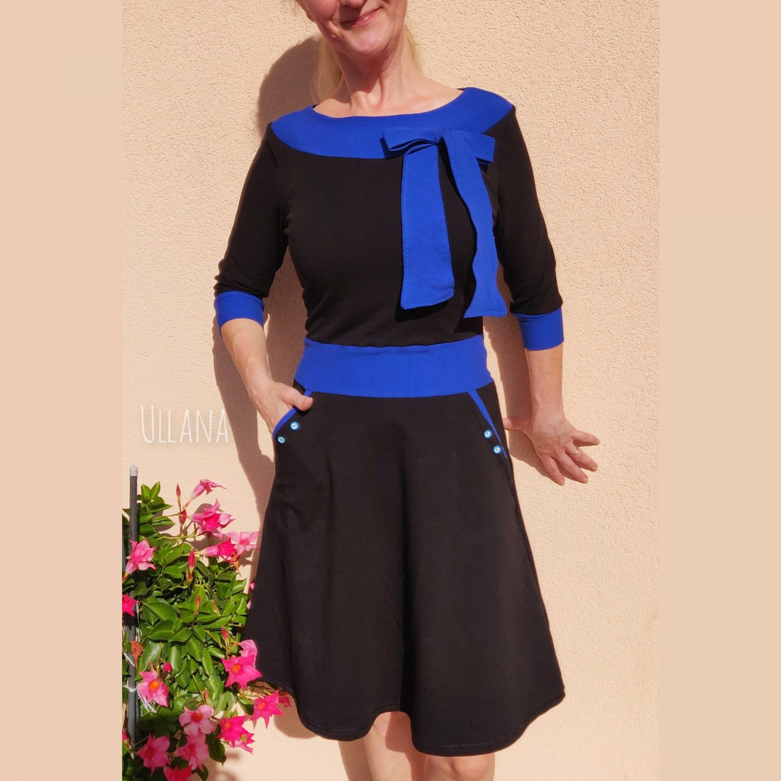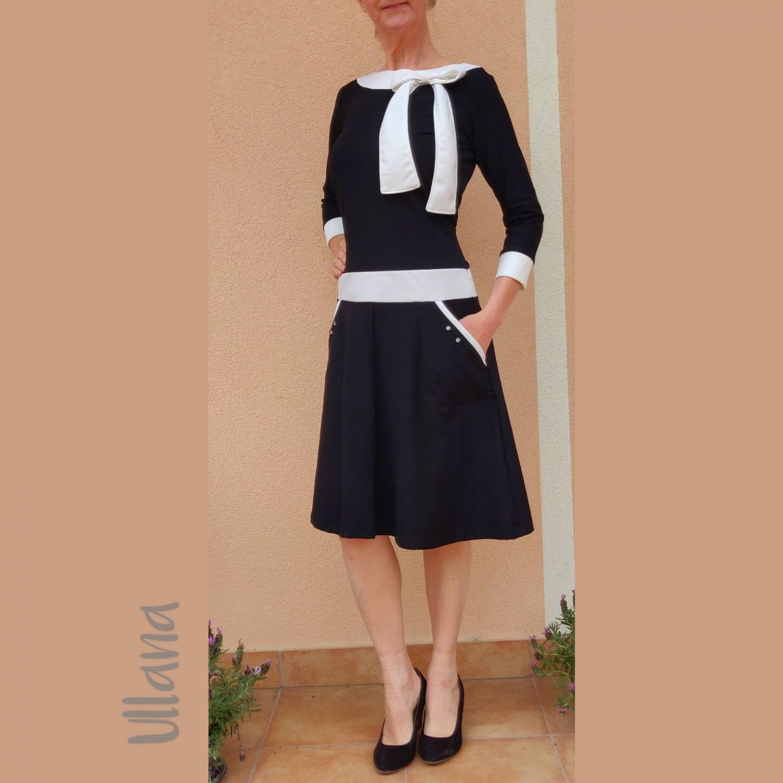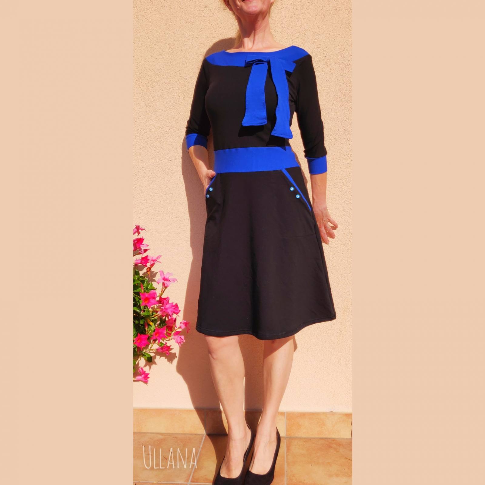 Oblekica v črni osnovi in z dodatki v roza ali beli. Zgornji del teliran, nizek všit pas, dva žepka. Nekoliko širši vratni izrez s pentljo.