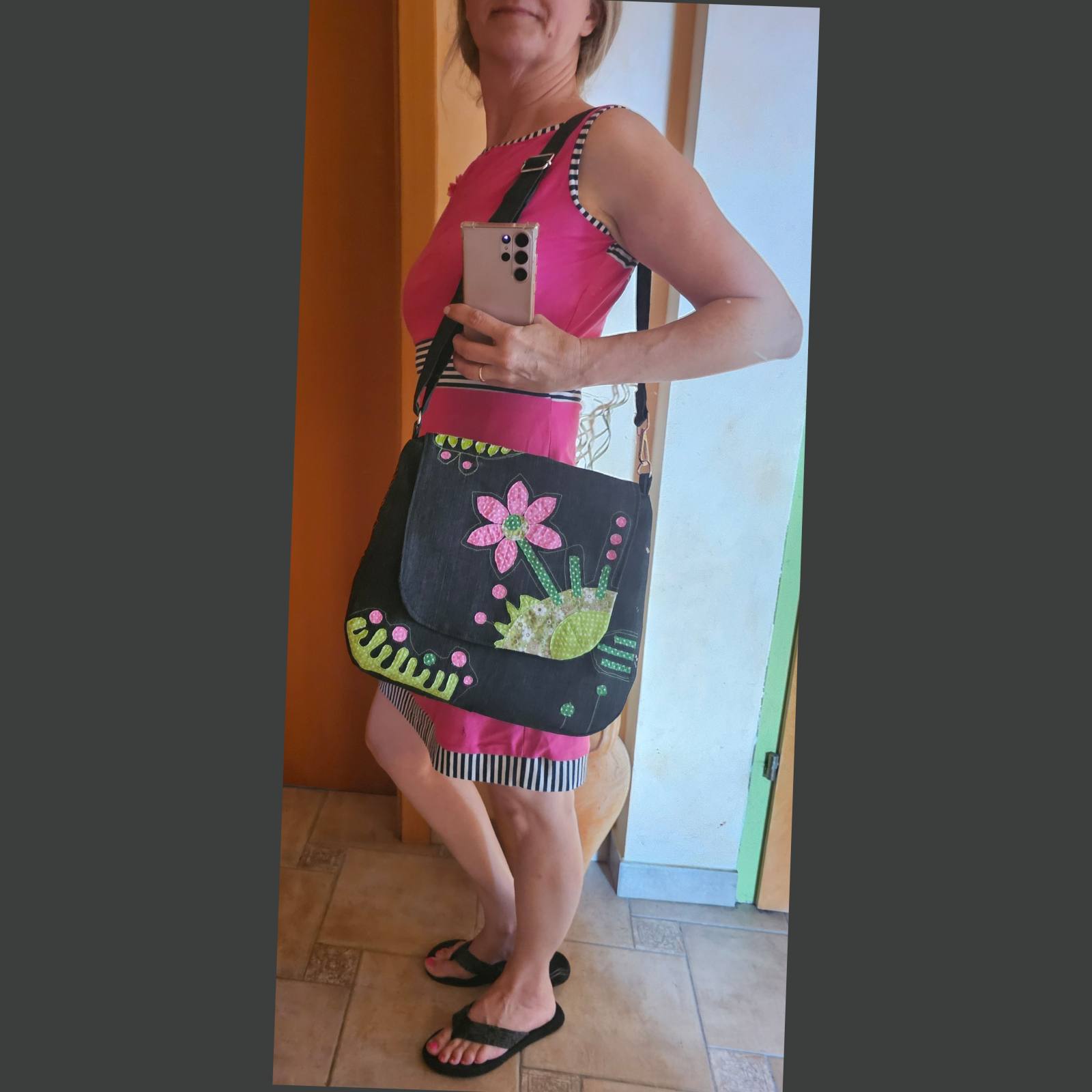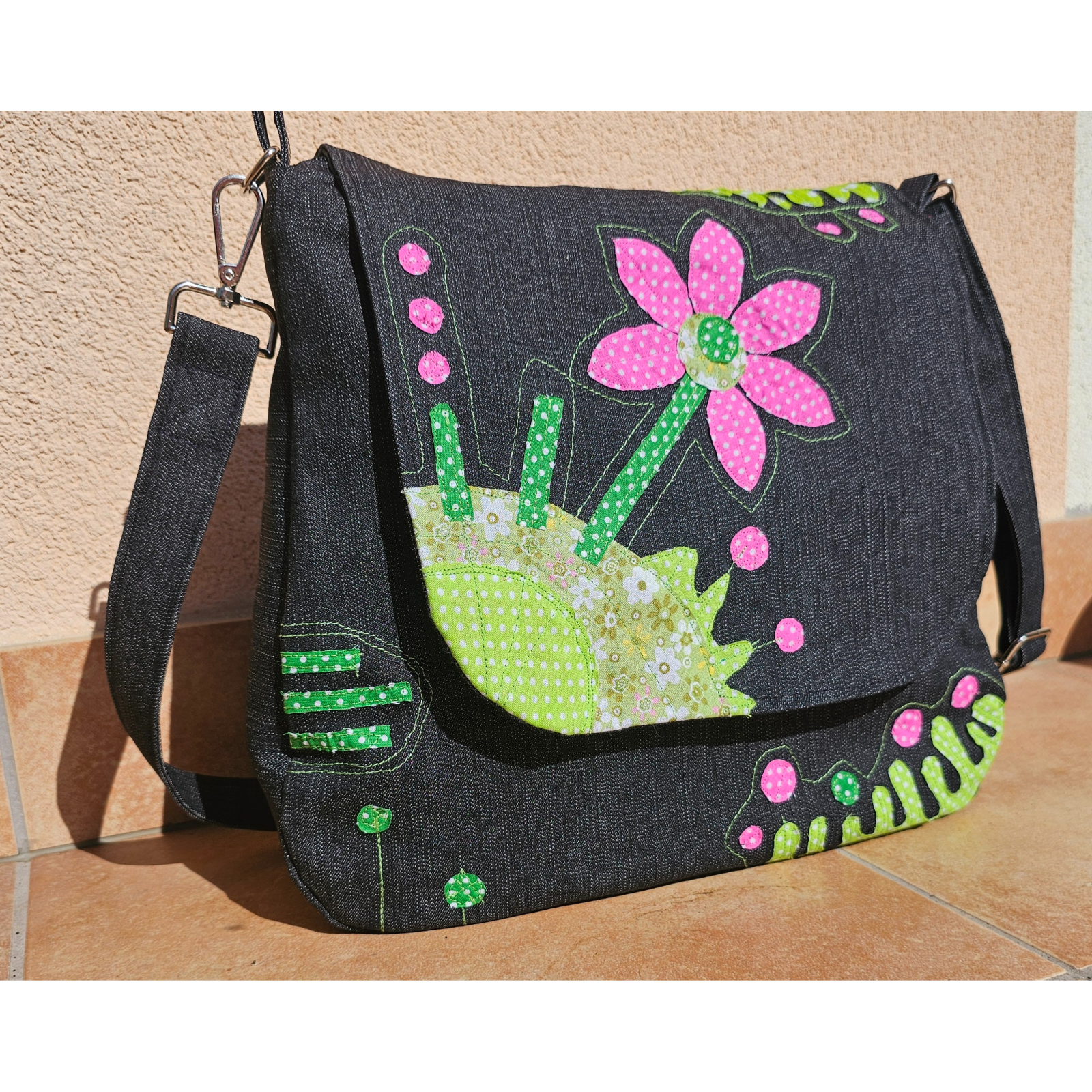 Aplikacije na prednji strani torbe so našite in so iz bombažnega blaga.