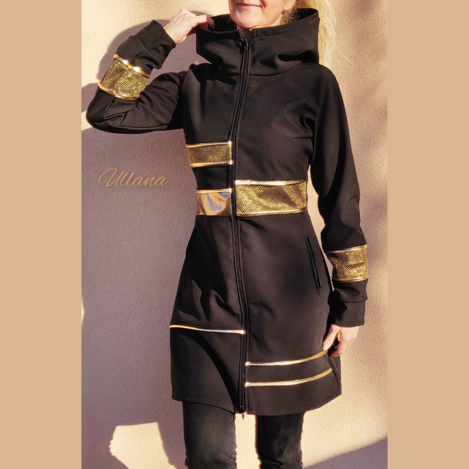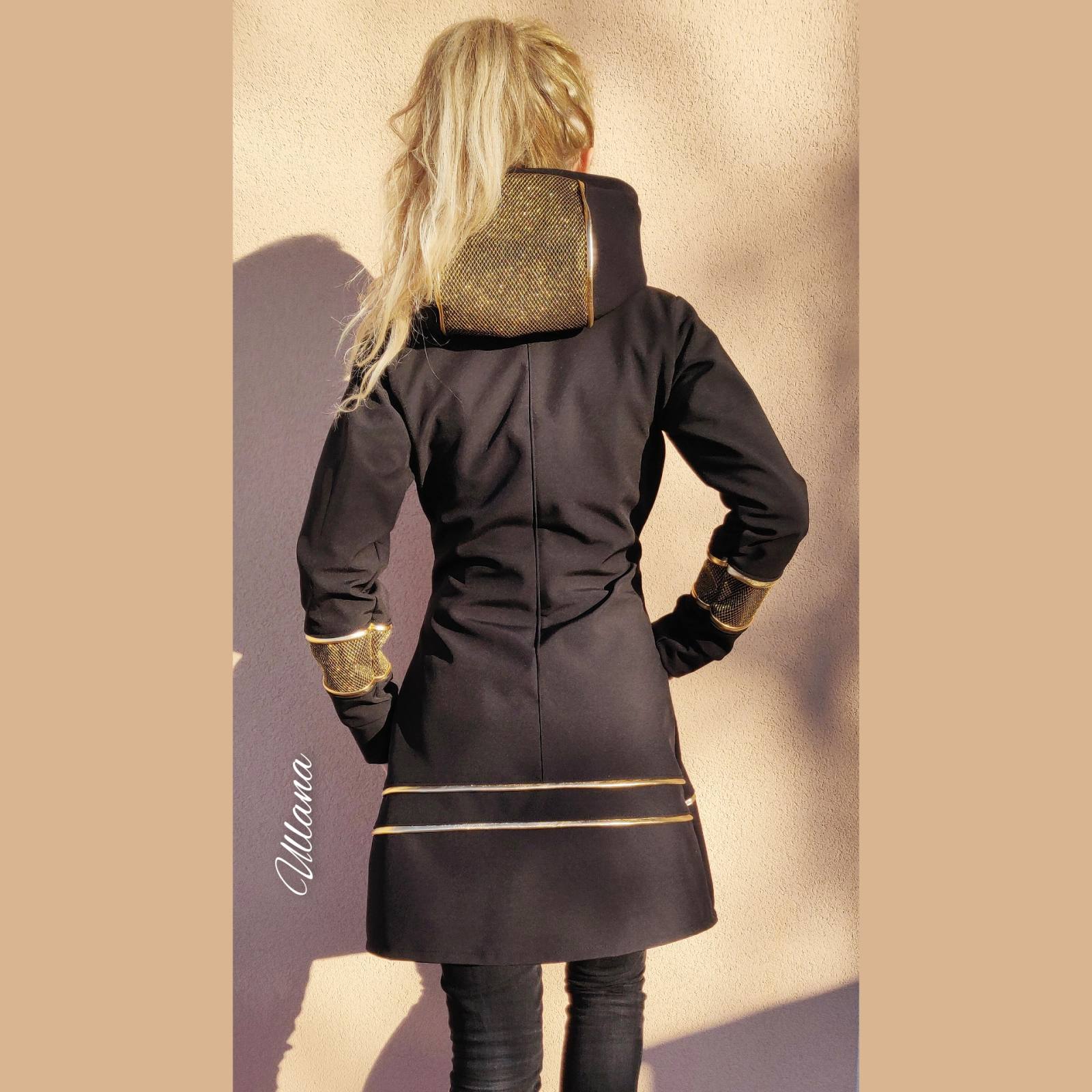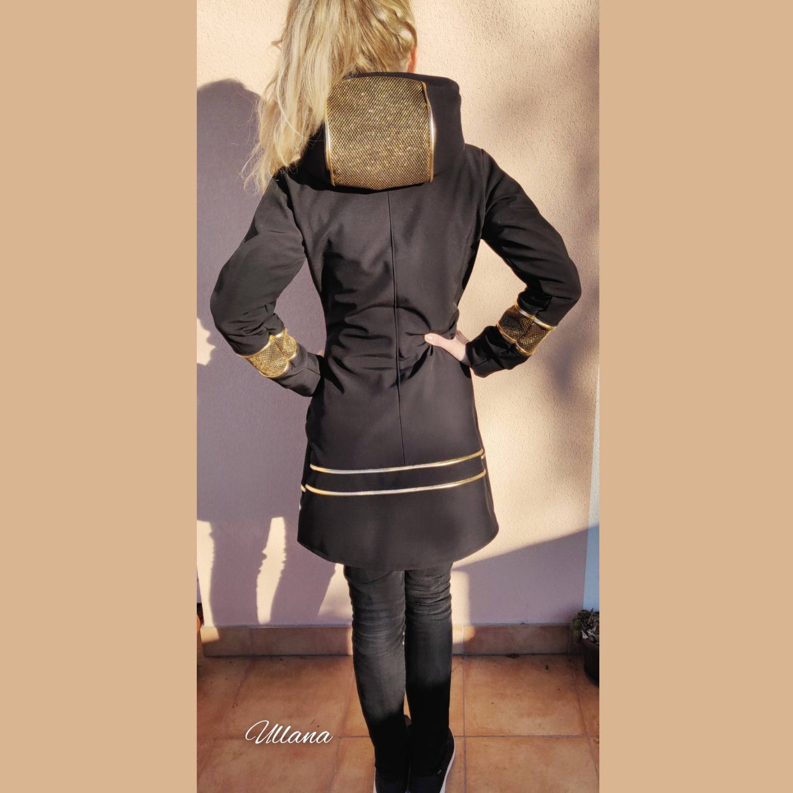 Softshell plašček ima veliko kapuco, zadrgo in dva žepa, ki se prav tako zapirata z zadrgo. Dodani so zlati všitki in zlati trakovi.