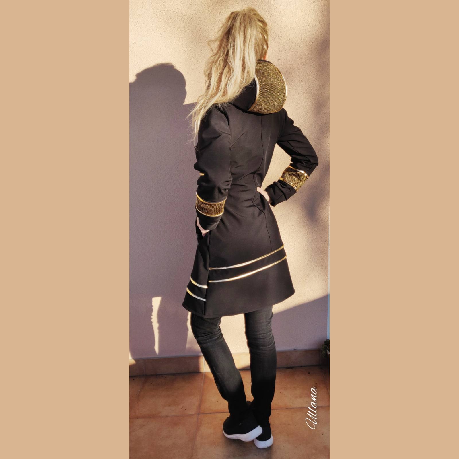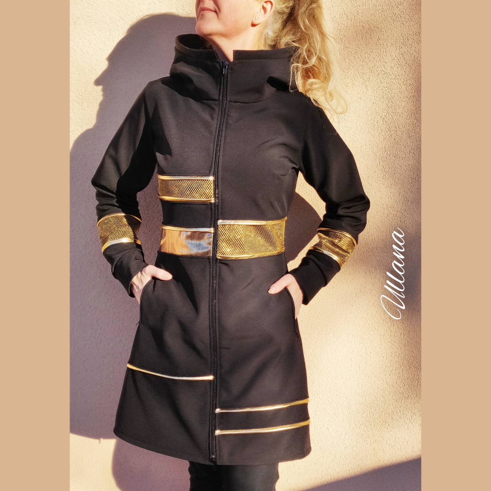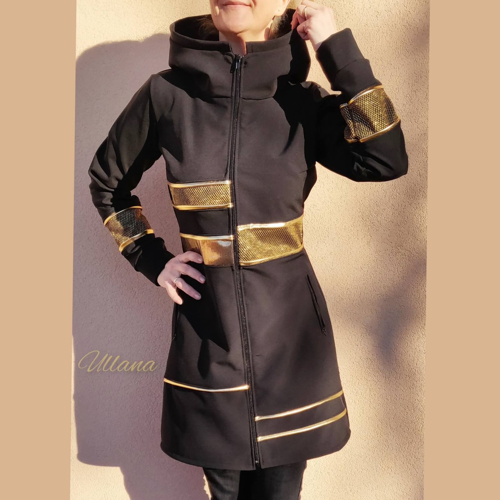 Softshell plašček ima veliko kapuco, zadrgo in dva žepa, ki se prav tako zapirata z zadrgo. Dodani so zlati všitki in zlati trakovi.