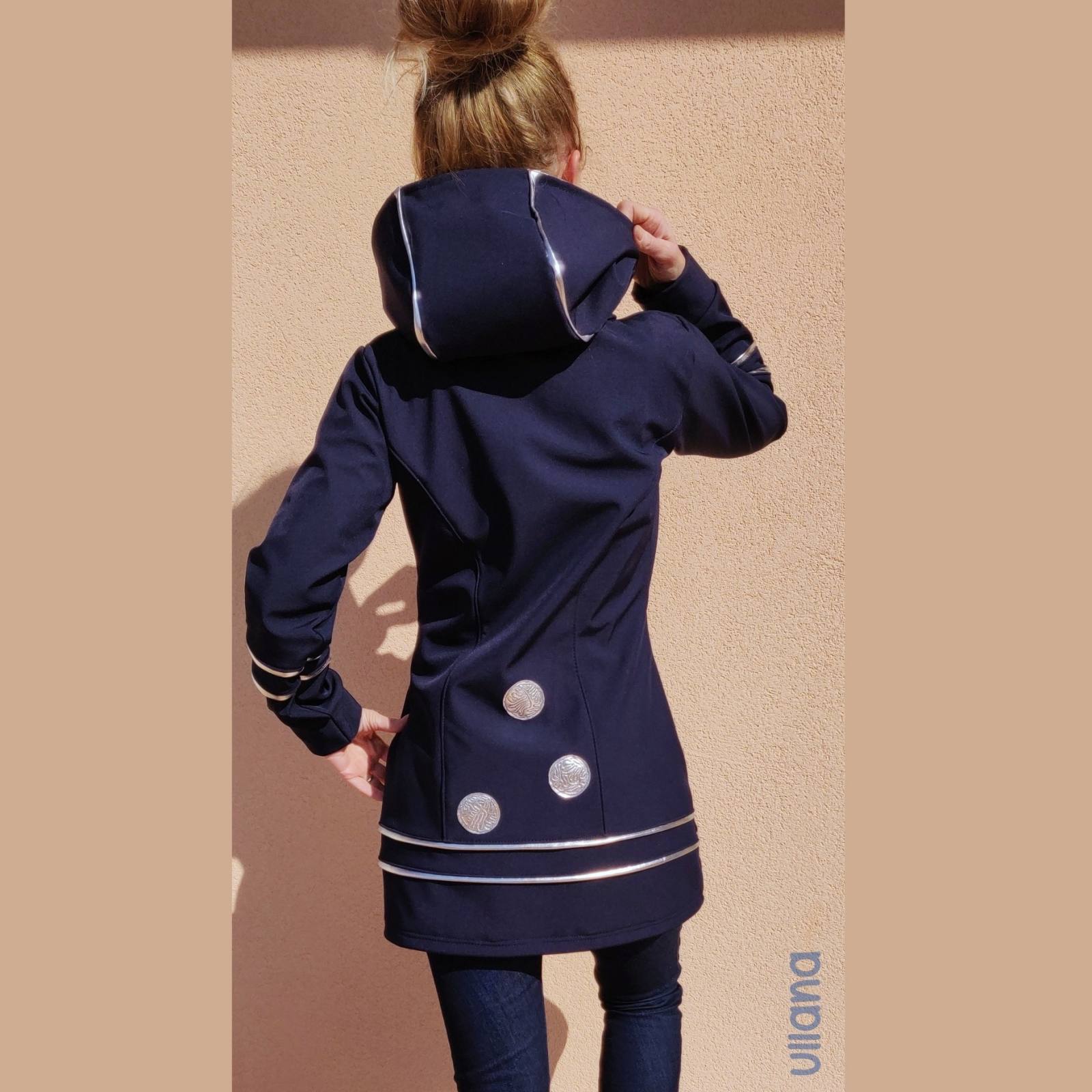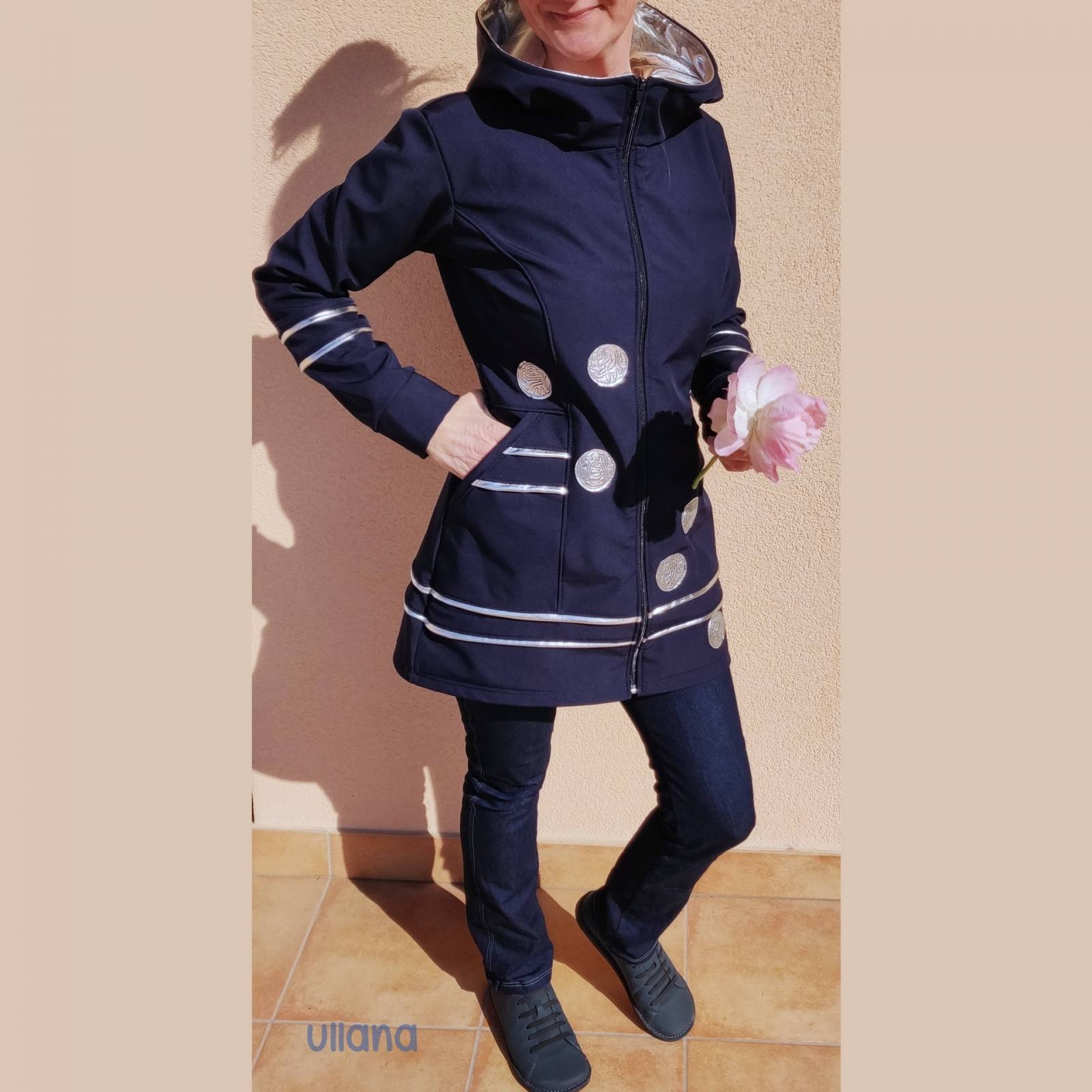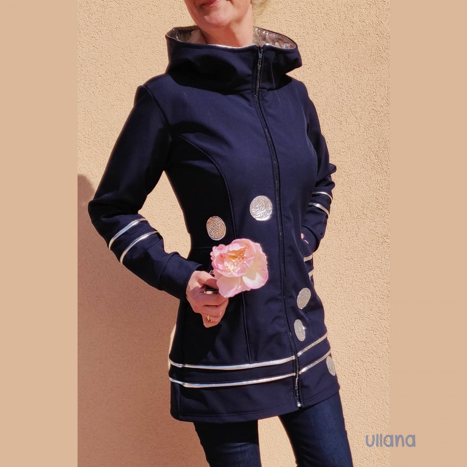 Prehoden softshell plašček iz kvalitetnega softshell blaga - na eni strani nepremočljivo blago, na drugi flis za toploto. Vsestransko uporabnen, teliran, z veliko kapuco in dvema žepoma in zadrgo. Osnovna barva: temno modra, všitki, pike in notranjost kapuce v srebrni barvi.