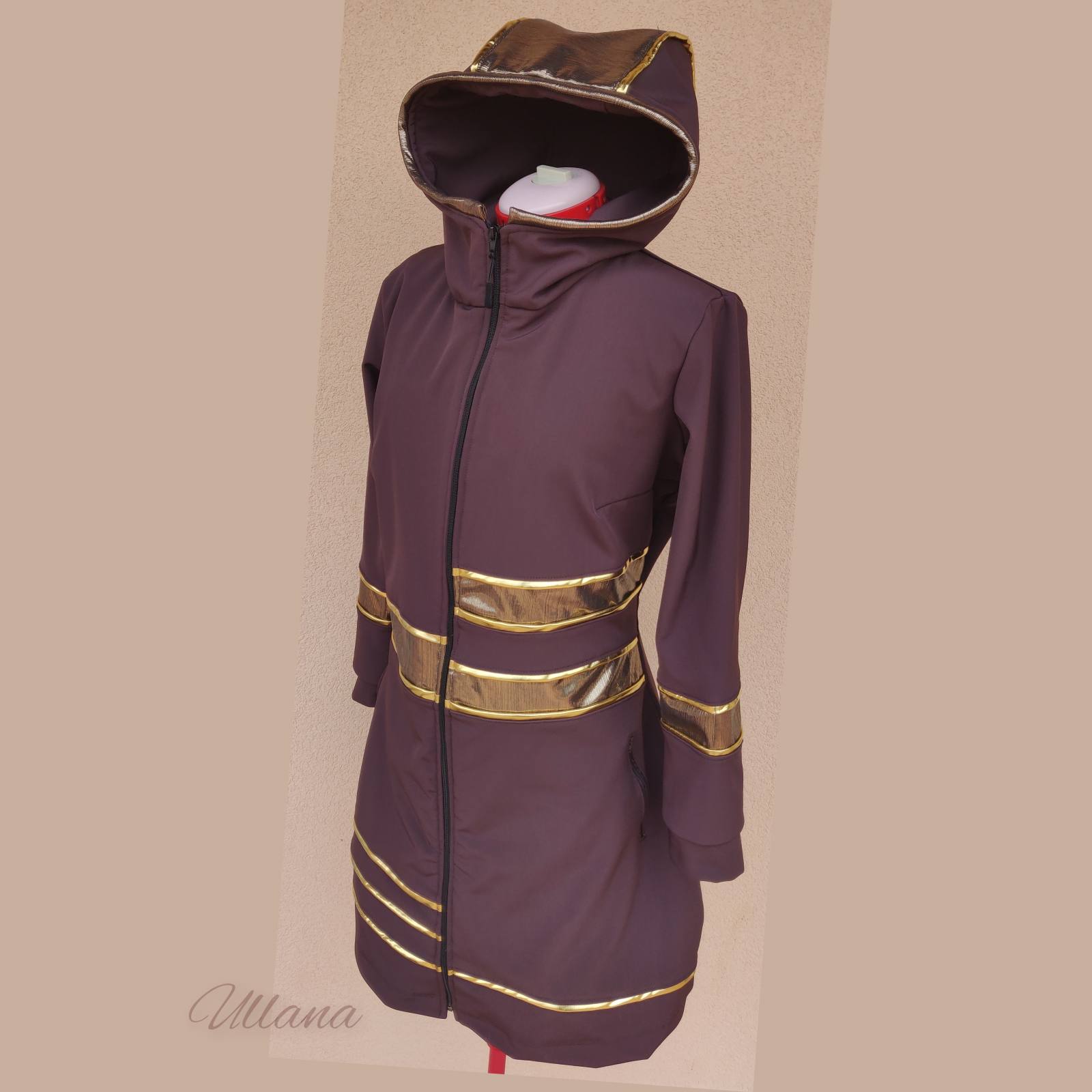 Prehoden softshell plašček iz kvalitetnega softshell blaga - na eni strani nepremočljivo blago, na drugi flis za toploto. Vsestransko uporabnen, teliran, z veliko kapuco in dvema žepoma in zadrgo. Osnovna barva: rjava, všitki in notranjost kapuce v zlati barvi.