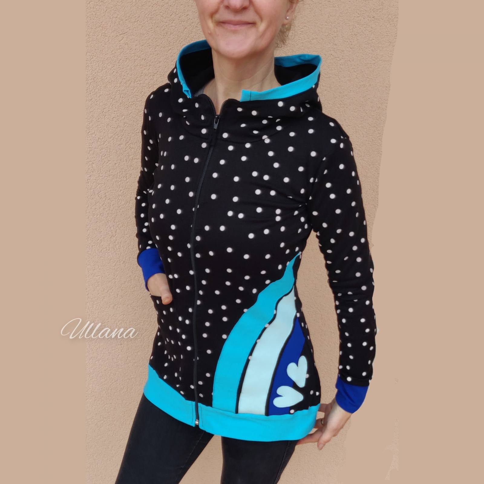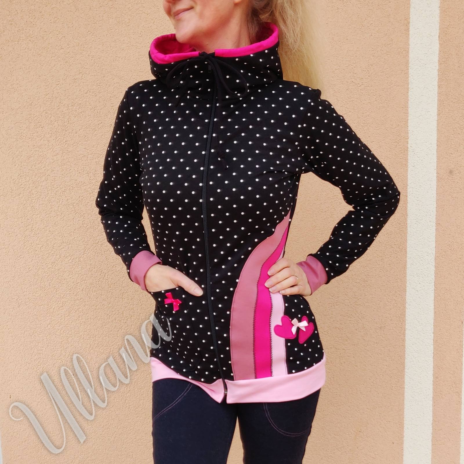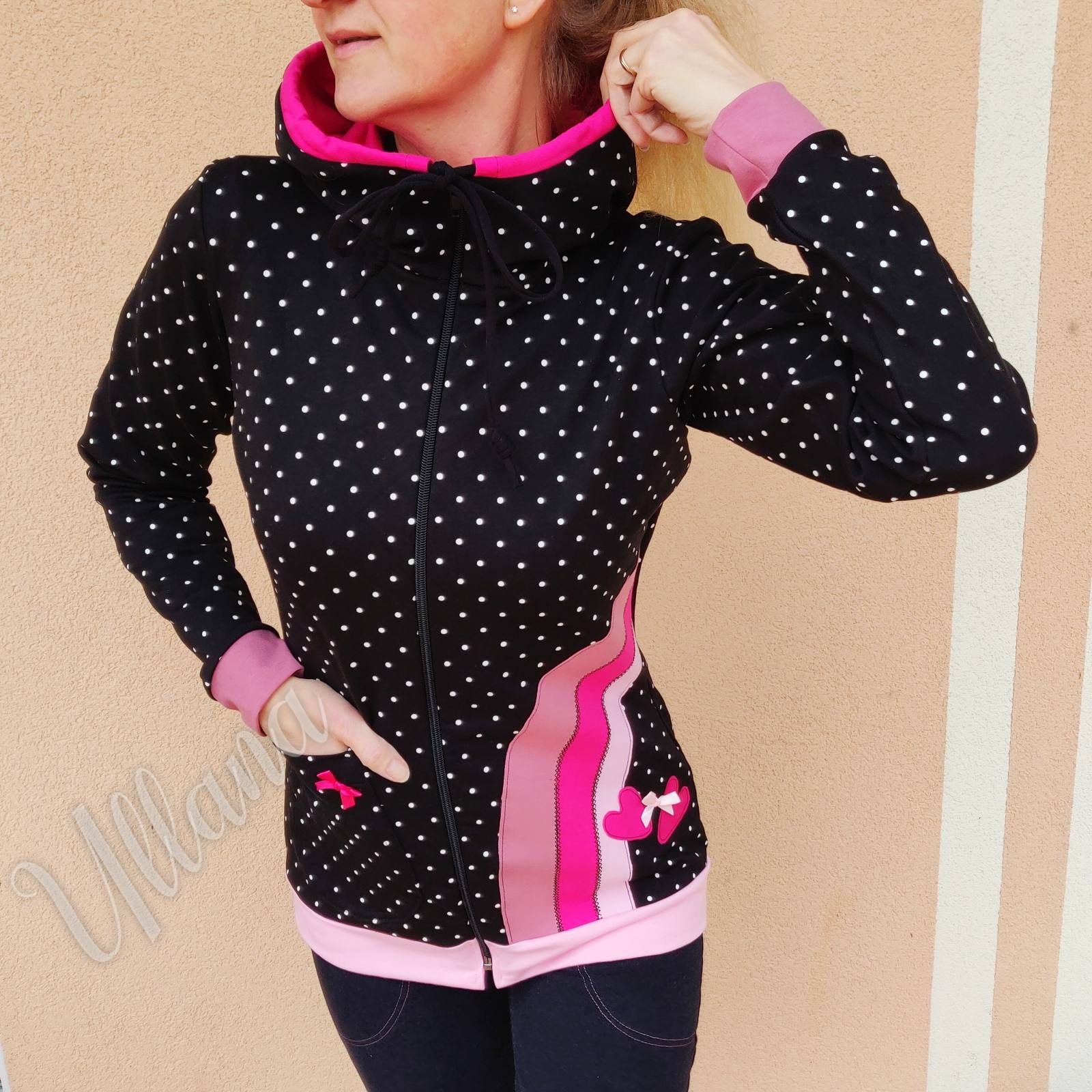 Jopica z belimi pikami in mavrico. Dva srčka. Na prednji strani žep, na drugi strani mavrica. Kapuca in zadrga. Mehka, udobna in lepa jopica!